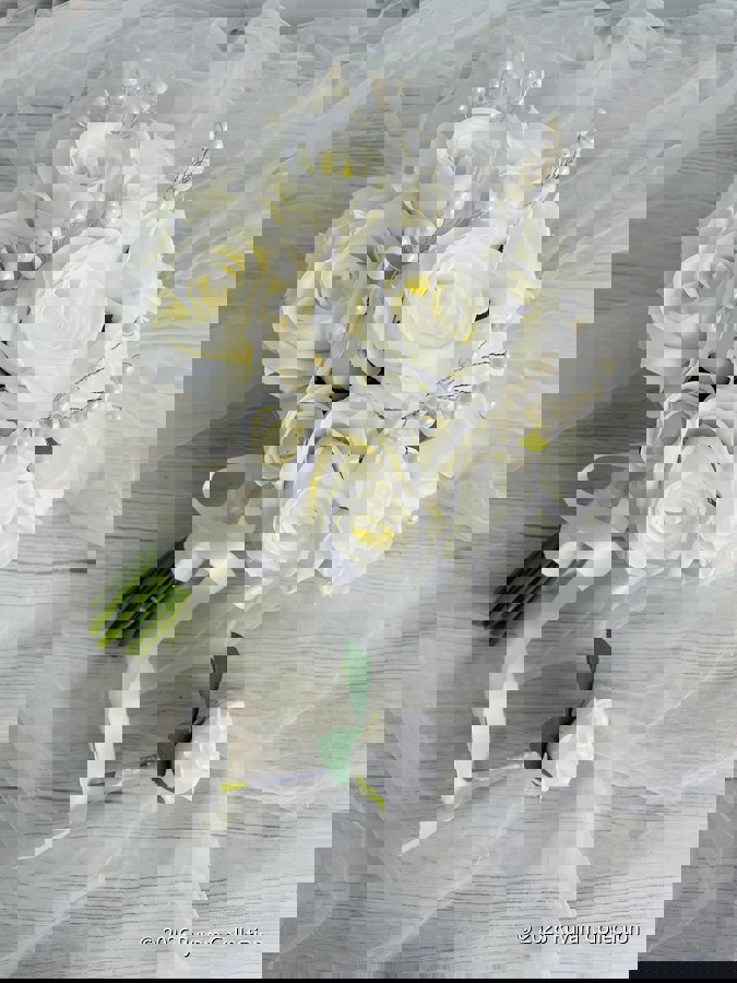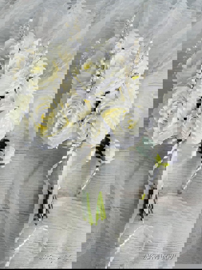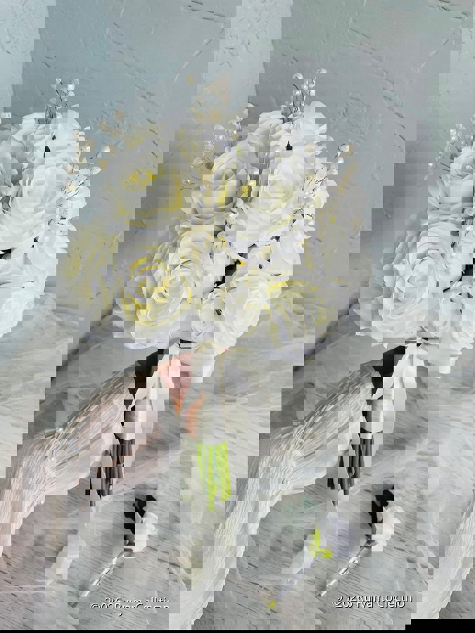 Beyaz güllerin zarif dansıyla hayat bulan bu özel tasarım gelin buketi, aşkın en saf halini yansıtır. Her gül, sevgiyle seçilmiş; her detay, zarafetle örülmüştür. Romantik ruhunu zarif dokunuşlarla ifade etmek isteyen gelinler için tasarlandı. Orta boydur ne büyük ne de küçük . Birinci sınıf kalitedeki çiçeklerden oluşmaktadır . Yaka çiçeği hediyedir. Teslim süresi 15-20 iş günüdür; acil tarihler için not kısmına belirtmeniz yeterlidir. 💌Ürünlerimiz tamamen el yapımıdır; bu nedenle her buket ve süs benzersizdir. Çiçeklerin yerleşimi ve detayları ufak farklılıklar gösterebilir, bu da ürünlerimize özel bir karakter katar.