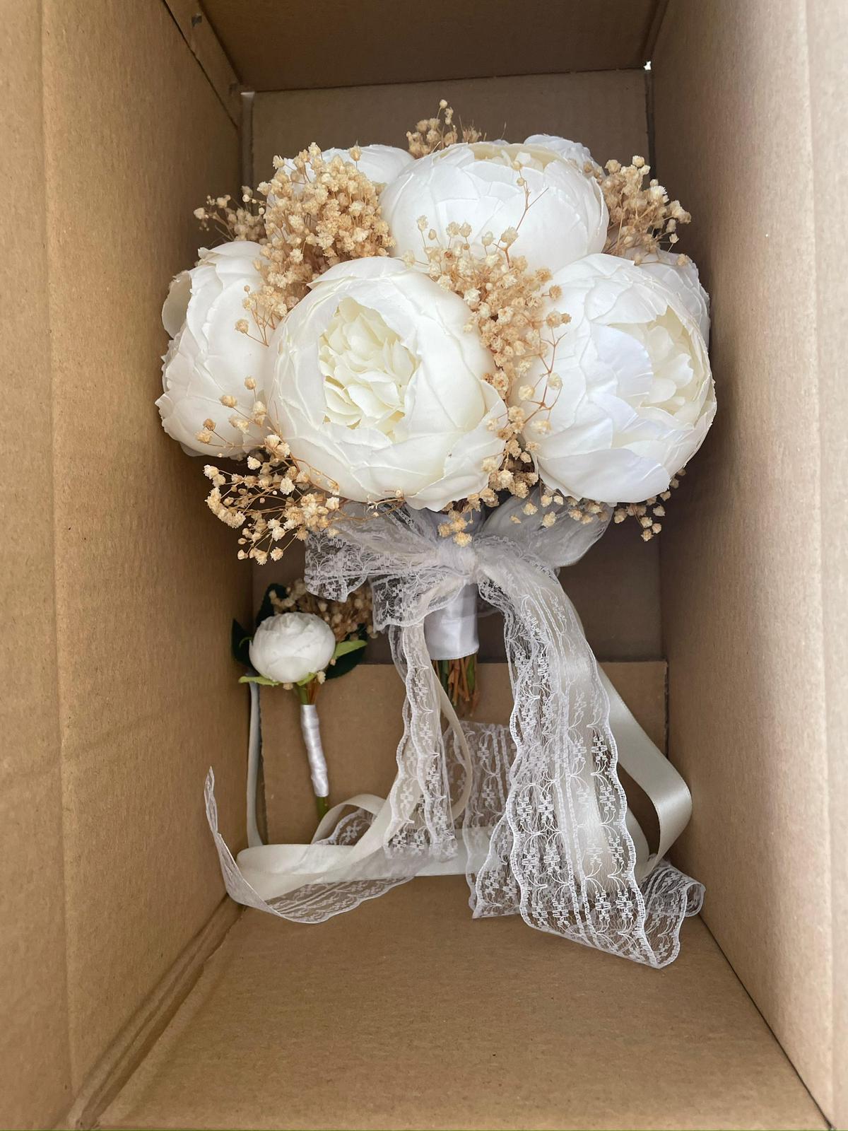 💐Gerçek çiçek görünümündeki birinci sınıf kumaş çiçek ve şoklanmış çiçekler ile hazırlanmıştır. Zarif ve sade tasarımıyla her gelinliğe uyum sağlar . Orta boydur ne büyük ne de küçük . Yaka çiçeği hediyedir. Teslim süresi 15-20 iş günüdür; acil tarihler için not kısmına belirtmeniz yeterlidir.💖 💌Ürünlerimiz tamamen el yapımıdır; bu nedenle her buket ve süs benzersizdir. Çiçeklerin yerleşimi ve detayları ufak farklılıklar gösterebilir, bu da ürünlerimize özel bir karakter katar. 💐