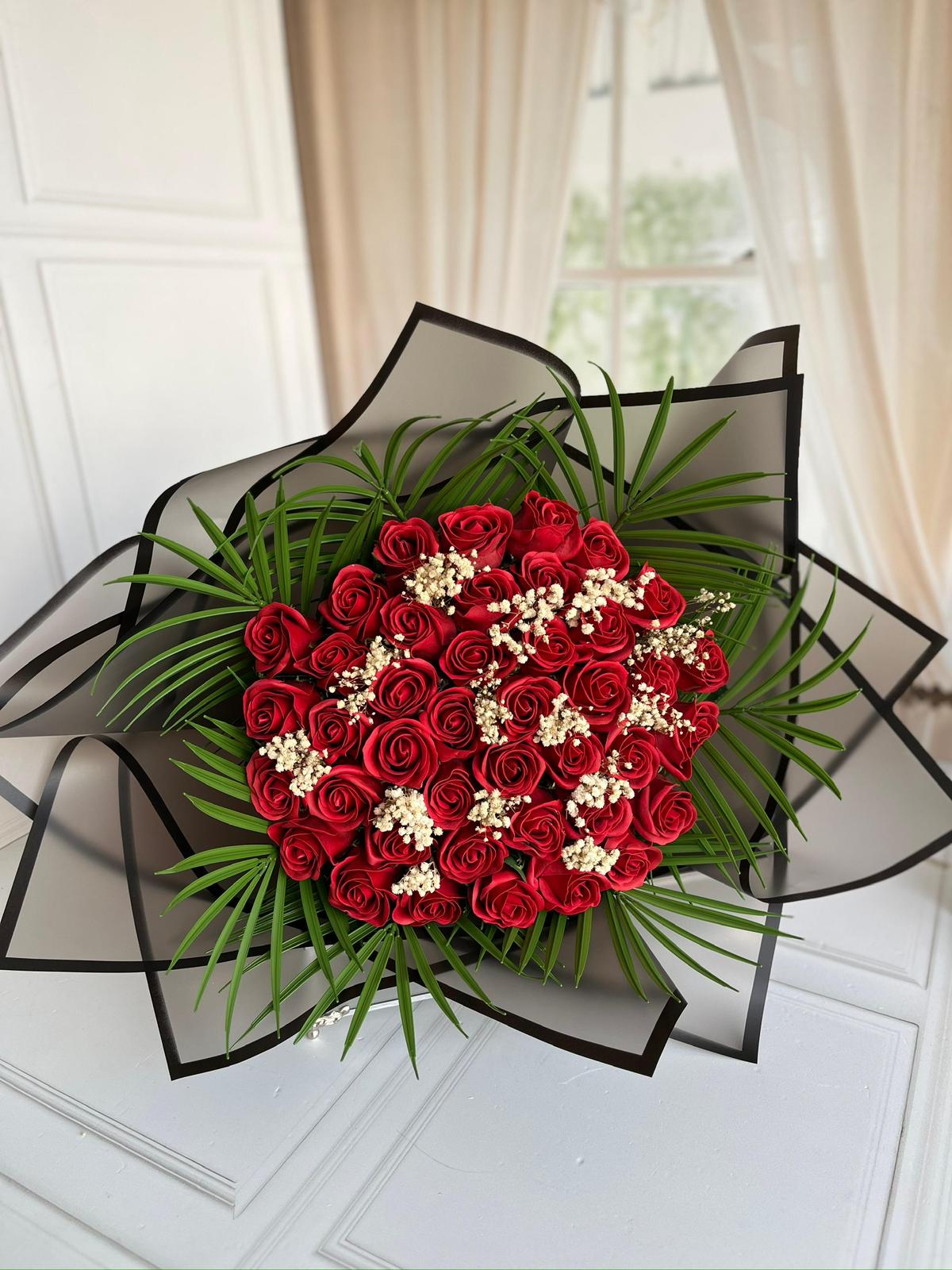💖İsteme törenlerine zarafet katacak özel tasarım! Yoğun kırmızı güller, siyah detaylı modern ambalajla birleşti. Sevginizin değerini göstermek için mükemmel bir tercih 💍🌹 41 adet yapay ıslak dokulu Gülden oluşuyor . Uzun ömürlüdür ☘️ Teslim süresi 15-20 iş günüdür; acil tarihler için not kısmına belirtmeniz yeterlidir. 💌Ürünlerimiz tamamen el yapımıdır; bu nedenle her buket ve süs benzersizdir. Çiçeklerin yerleşimi ve detayları ufak farklılıklar gösterebilir, bu da ürünlerimize özel bir karakter katar. 💐