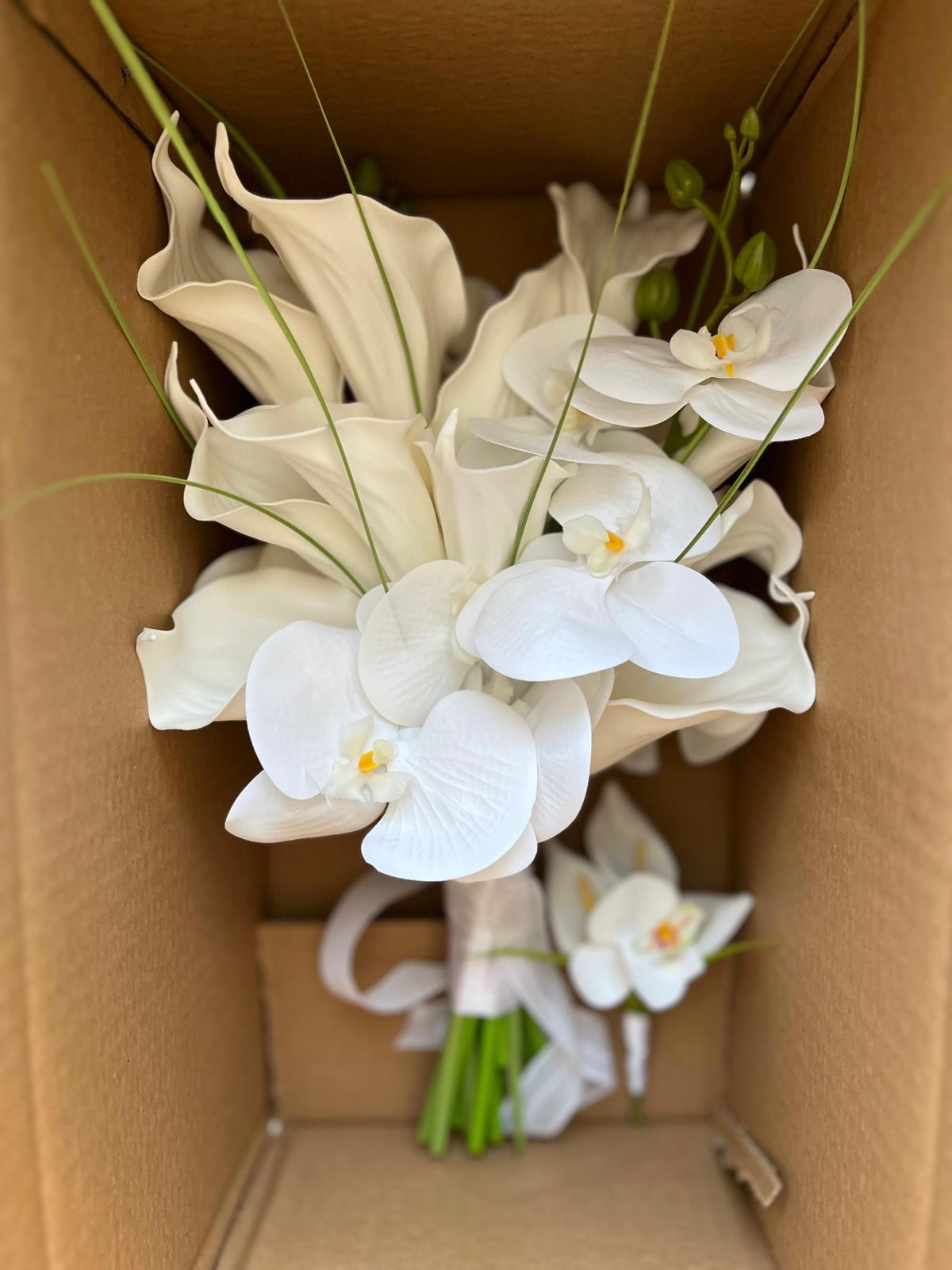 💫Beyazın huzuru, zarif çiçeklerin dengesiyle birleşti. Gala ve orkidelerden oluşan bu özel buket, sadeliğiyle büyüleyen gelinler için tasarlandı. Doğal, zarif ve kusursuz bir uyum. ✨ Yapay ama ıslak dokulu birinci sınıf kalitedeki çiçeklerden oluşmaktadır, ömürlüktür. Orta boydur ne büyük ne de küçük. Yaka çiçeği hediyedir.✨ Teslim süresi 15-20 iş günüdür; acil tarihler için not kısmına belirtmeniz yeterlidir. 💌Ürünlerimiz tamamen el yapımıdır; bu nedenle her buket ve süs benzersizdir. Çiçeklerin yerleşimi ve detayları ufak farklılıklar gösterebilir, bu da ürünlerimize özel bir karakter katar. 💐