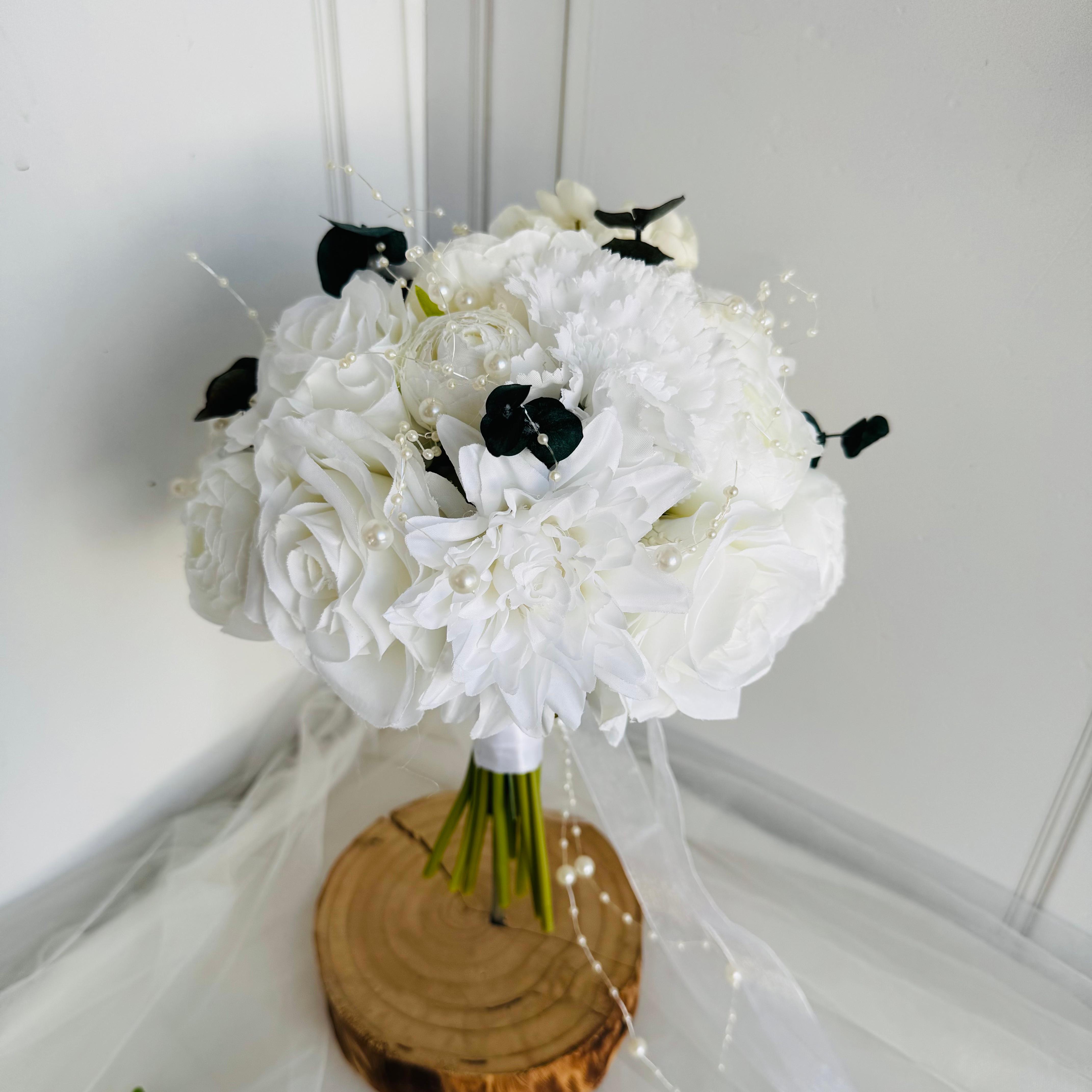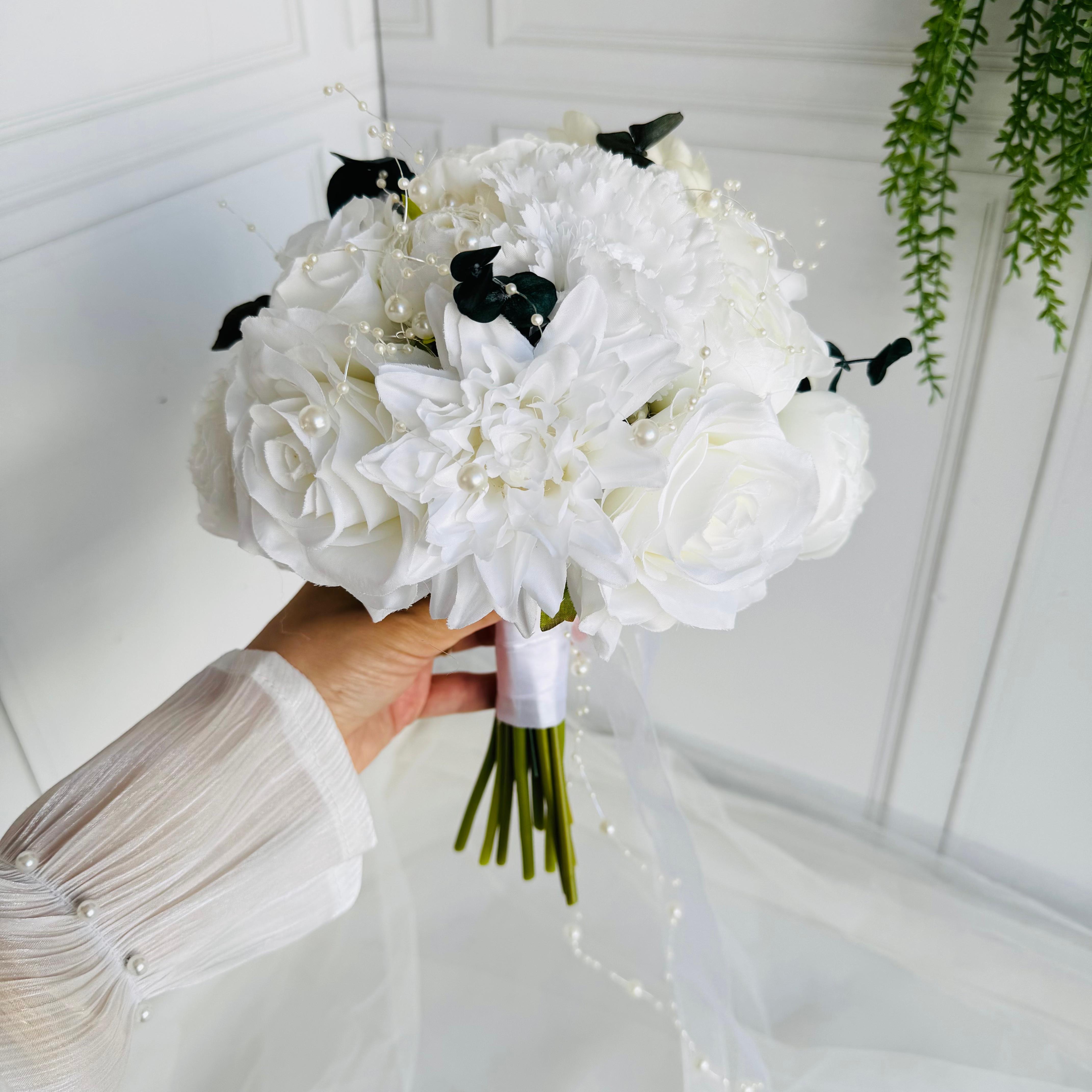 💫Birinci sınıf kalitedeki kumaş ve şoklanmış çiçeklerle hazırlanmış bu özel buket beyaz çiçeklerin uyumuyla ömürlük bir şıklık sunar. Özgün formu ile her detayı zarafet dolu bir tasarım.✨ Orta boydur ne büyük ne de küçük. Yaka çiçeği hediyedir. Teslim süresi 15-20 iş günüdür; acil tarihler için not kısmına belirtmeniz yeterlidir. 💌Ürünlerimiz tamamen el yapımıdır; bu nedenle her buket ve süs benzersizdir. Çiçeklerin yerleşimi ve detayları ufak farklılıklar gösterebilir, bu da ürünlerimize özel bir karakter katar. 💐