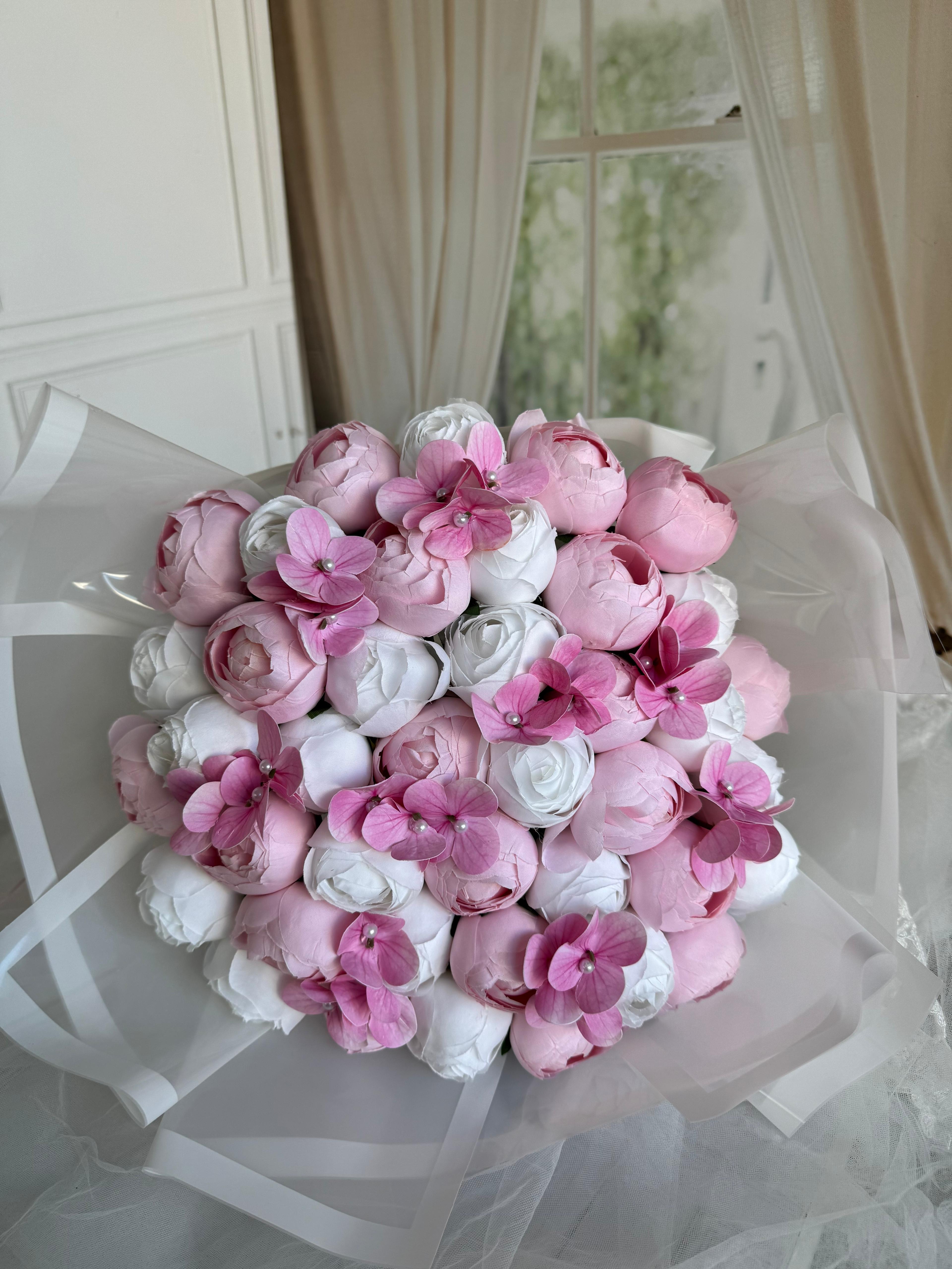 ?Bu zarif buket , romantik pembesi ve yumuşak dokusuyla kalpleri fetheder. Sevginizi en şık şekilde ifade eder.? Ömürlüktür. Büyük boydur. Teslim süresi 15-20 iş günüdür; acil tarihler için not kısmına belirtmeniz yeterlidir. Ürünlerimiz tamamen el yapımıdır; bu nedenle her buket ve süs benzersizdir. Çiçeklerin yerleşimi ve detayları ufak farklılıklar gösterebilir, bu da ürünlerimize özel bir karakter katar. ?