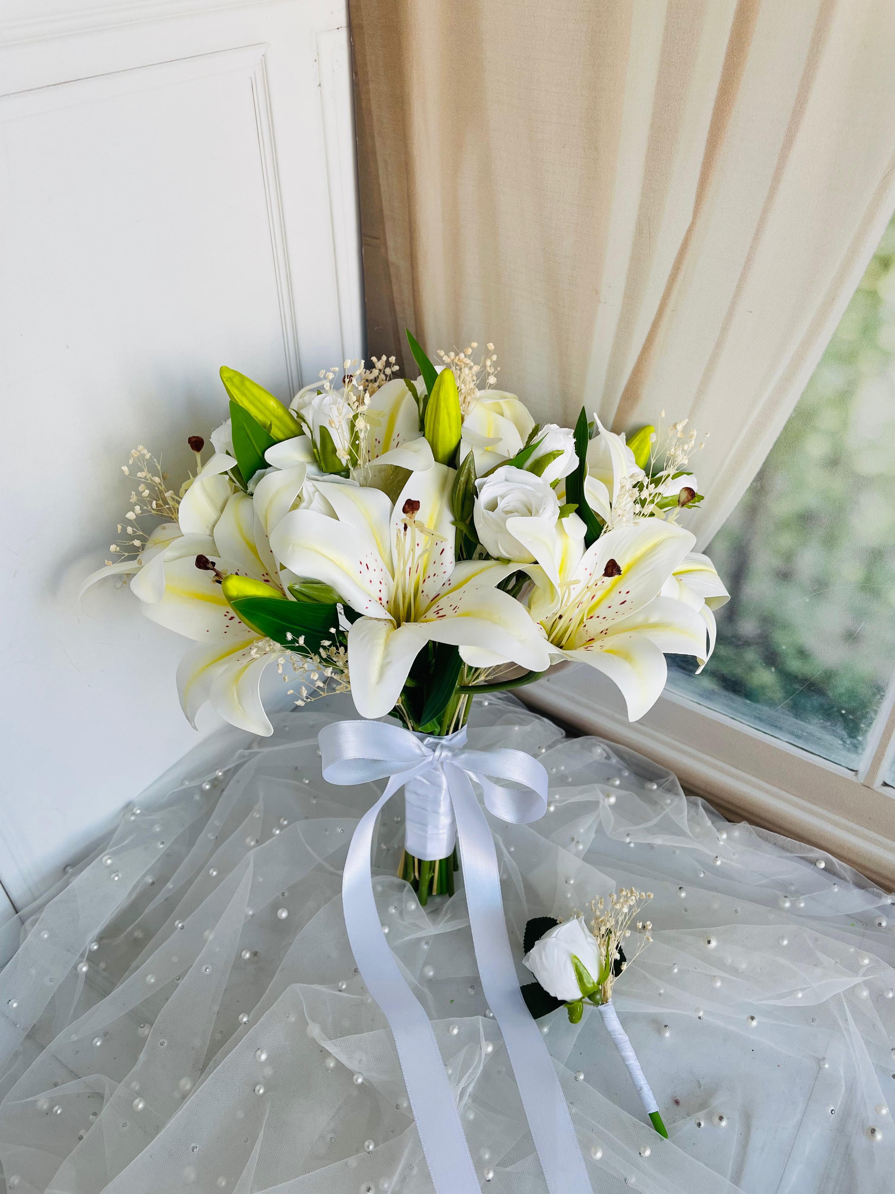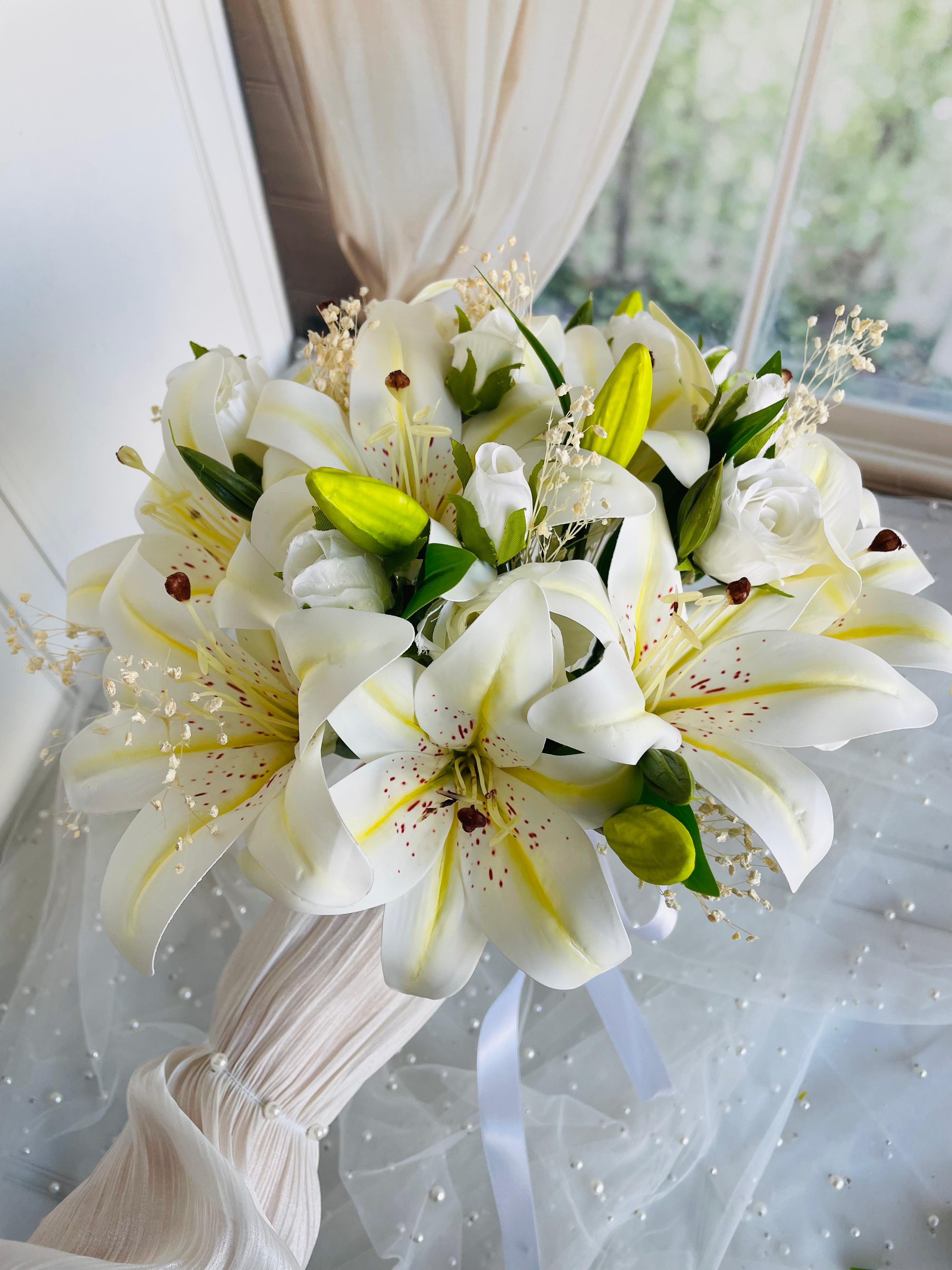 Zarif çizgileri ve kalıcı dokusuyla lilyumlardan hazırlanan bu özel buket, düğün gününüzü unutulmaz kılmak için tasarlandı. Solmayan yapısıyla uzun süre ilk günkü tazeliğini korur ve her özel an için etkileyici bir tercih sunar.? Orta boydur ne büyük ne de küçük. Yaka çiçeği hediyedir. Teslim süresi 15-20 iş günüdür; acil tarihler için not kısmına belirtmeniz yeterlidir. ?Ürünlerimiz tamamen el yapımıdır; bu nedenle her buket ve süs benzersizdir. Çiçeklerin yerleşimi ve detayları ufak farklılıklar gösterebilir, bu da ürünlerimize özel bir karakter katar. ?