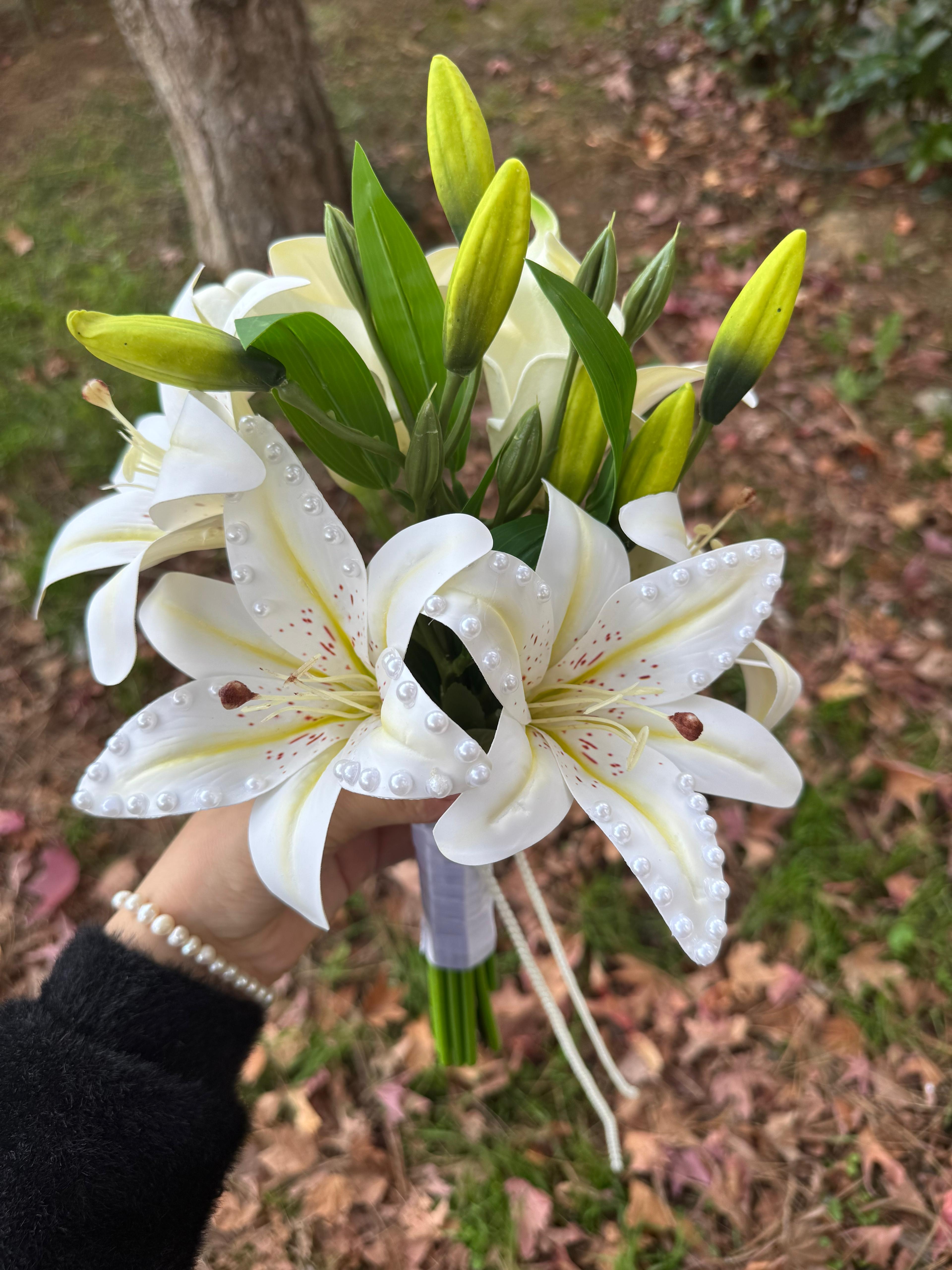 Zarif çizgileri ve kalıcı dokusuyla lilyumlardan hazırlanan bu özel buket, düğün gününüzü unutulmaz kılmak için tasarlandı. Solmayan yapısıyla uzun süre ilk günkü tazeliğini korur ve her özel an için etkileyici bir tercih sunar.? Orta boydur ne büyük ne de küçük. Yaka çiçeği hediyedir. Teslim süresi 15-20 iş günüdür; acil tarihler için not kısmına belirtmeniz yeterlidir. ?Ürünlerimiz tamamen el yapımıdır; bu nedenle her buket ve süs benzersizdir. Çiçeklerin yerleşimi ve detayları ufak farklılıklar gösterebilir, bu da ürünlerimize özel bir karakter katar. ?