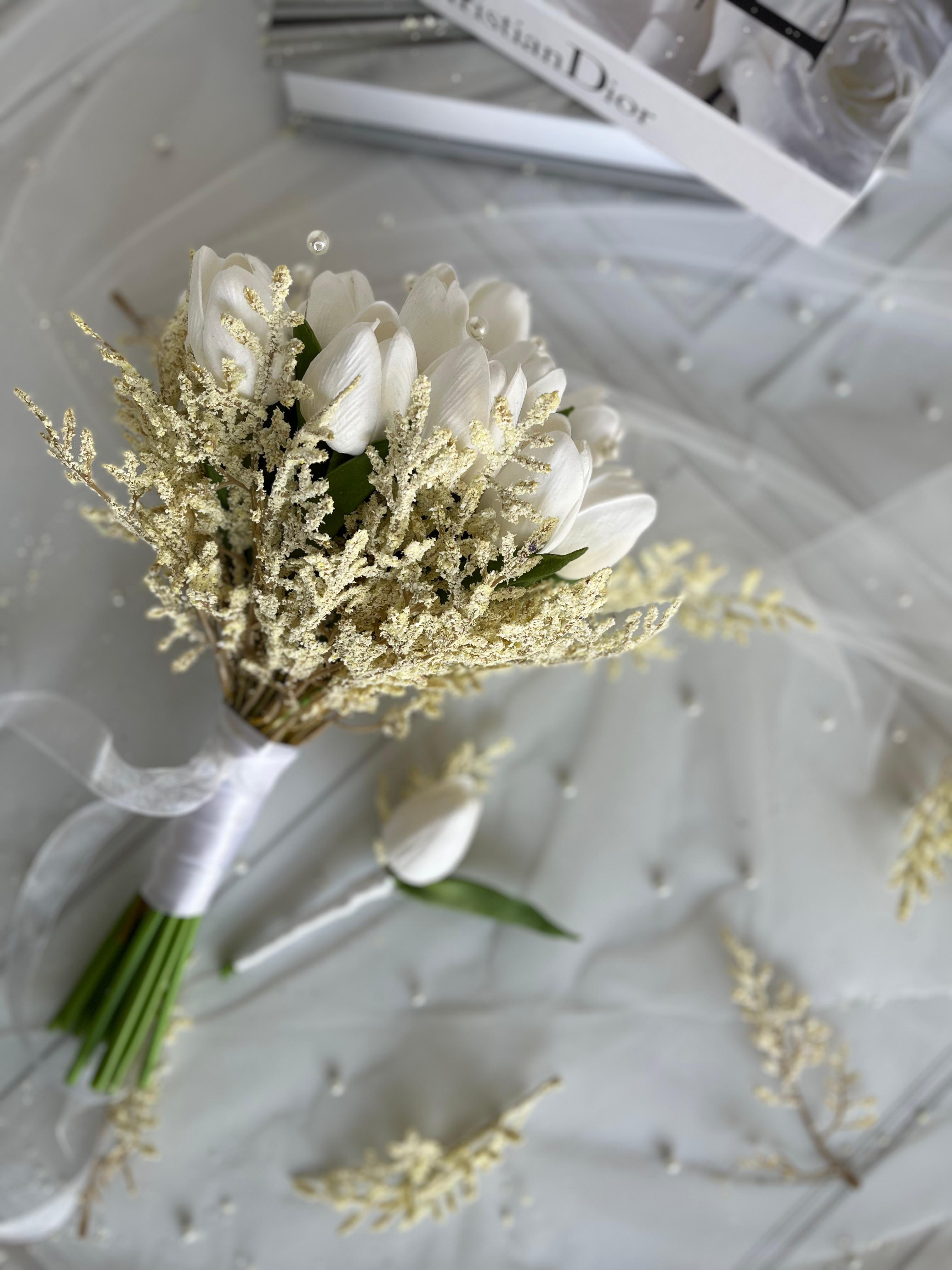 Beyaz lalelerin sade zarafeti, inci dokunuşlar ile birleşerek modern ve sofistike bir görünüm sunar. Temiz, minimal bir gelin buket arayanlar için ideal seçimdir.? Orta boydur ne büyük ne de küçük. Yaka çiçeği hediyedir. Teslim süresi 15-20 iş günüdür; acil tarihler için not kısmına belirtmeniz yeterlidir. ?Ürünlerimiz tamamen el yapımıdır; bu nedenle her buket ve süs benzersizdir. Çiçeklerin yerleşimi ve detayları ufak farklılıklar gösterebilir, bu da ürünlerimize özel bir karakter katar. ?