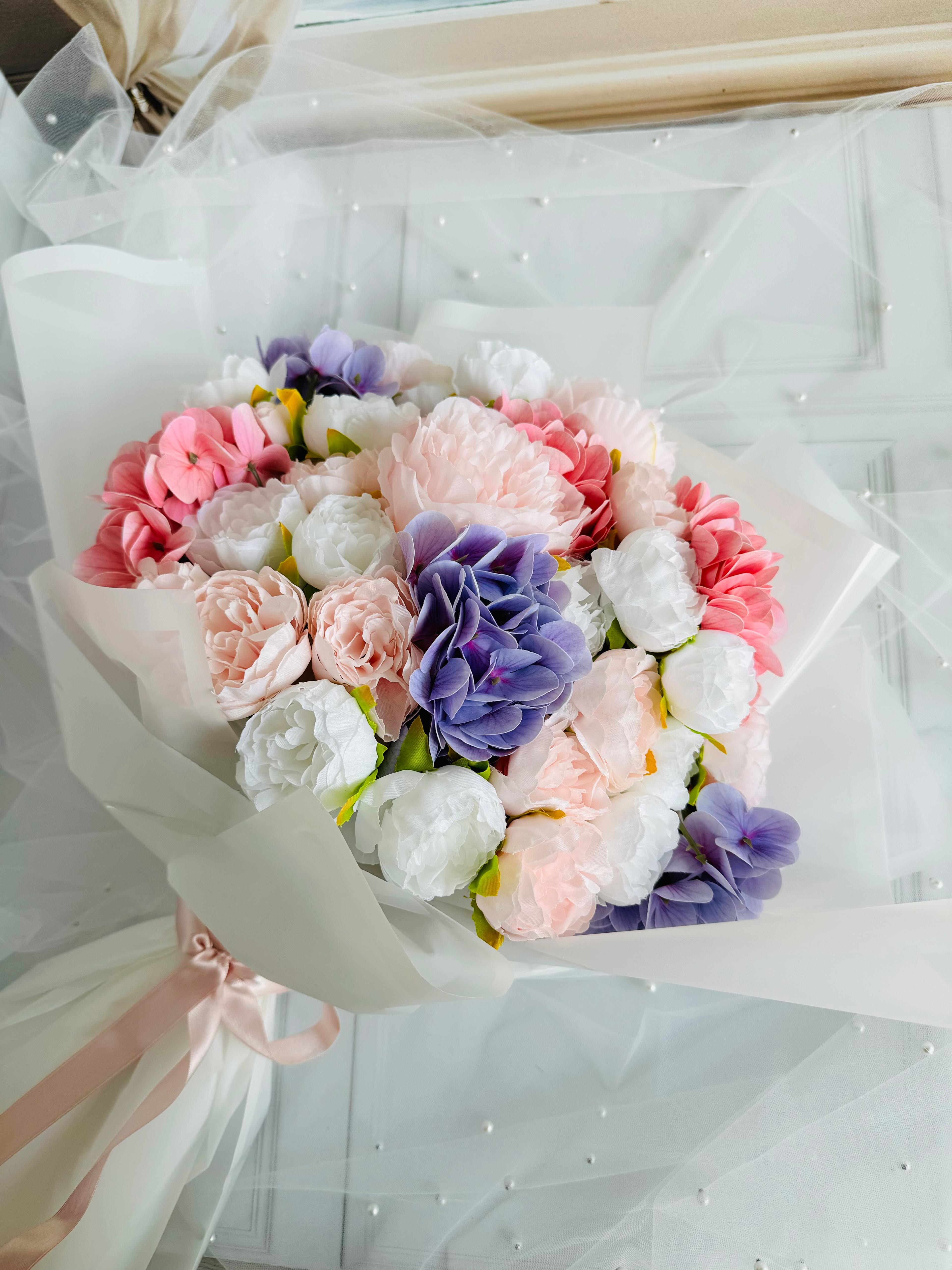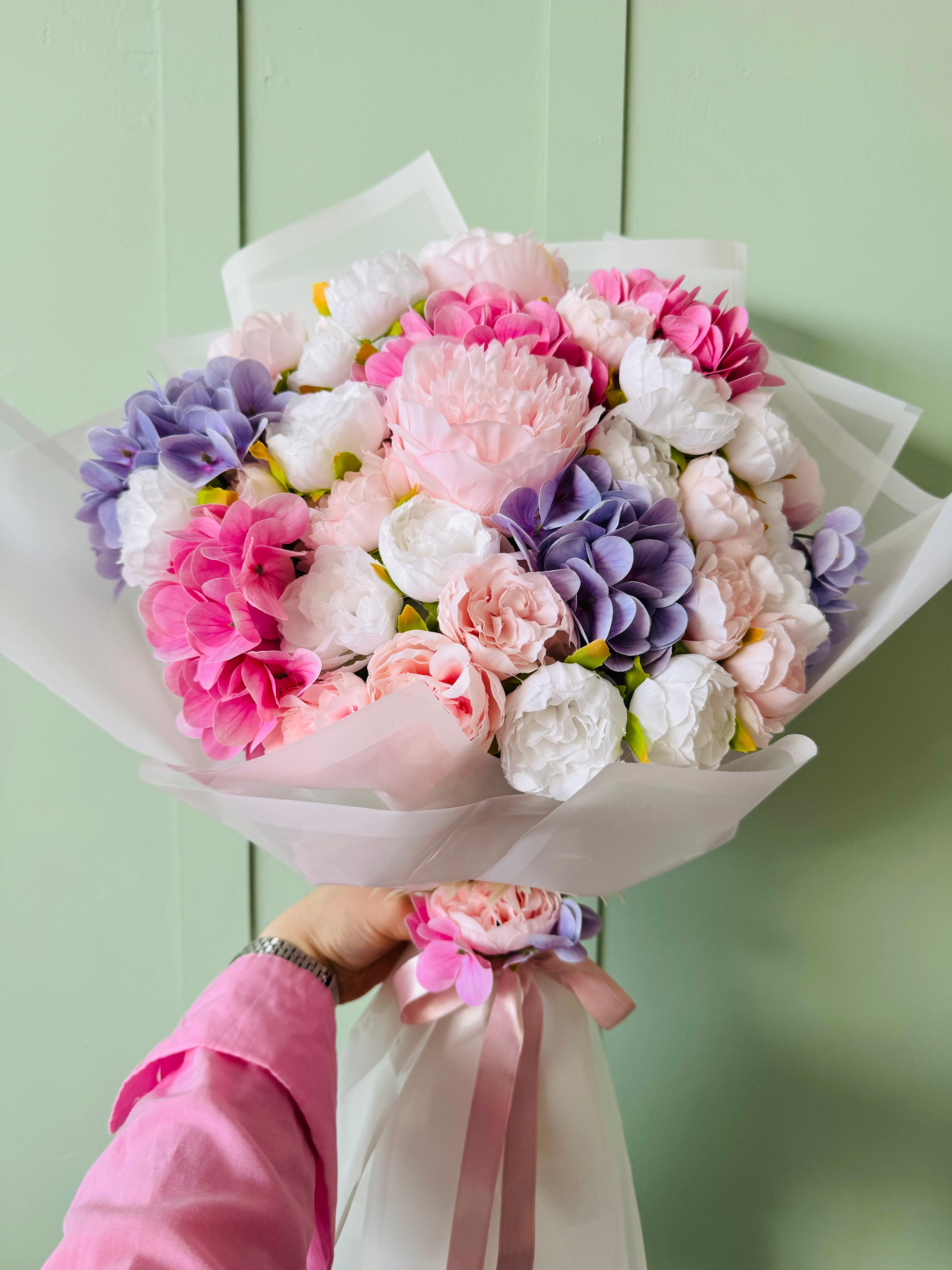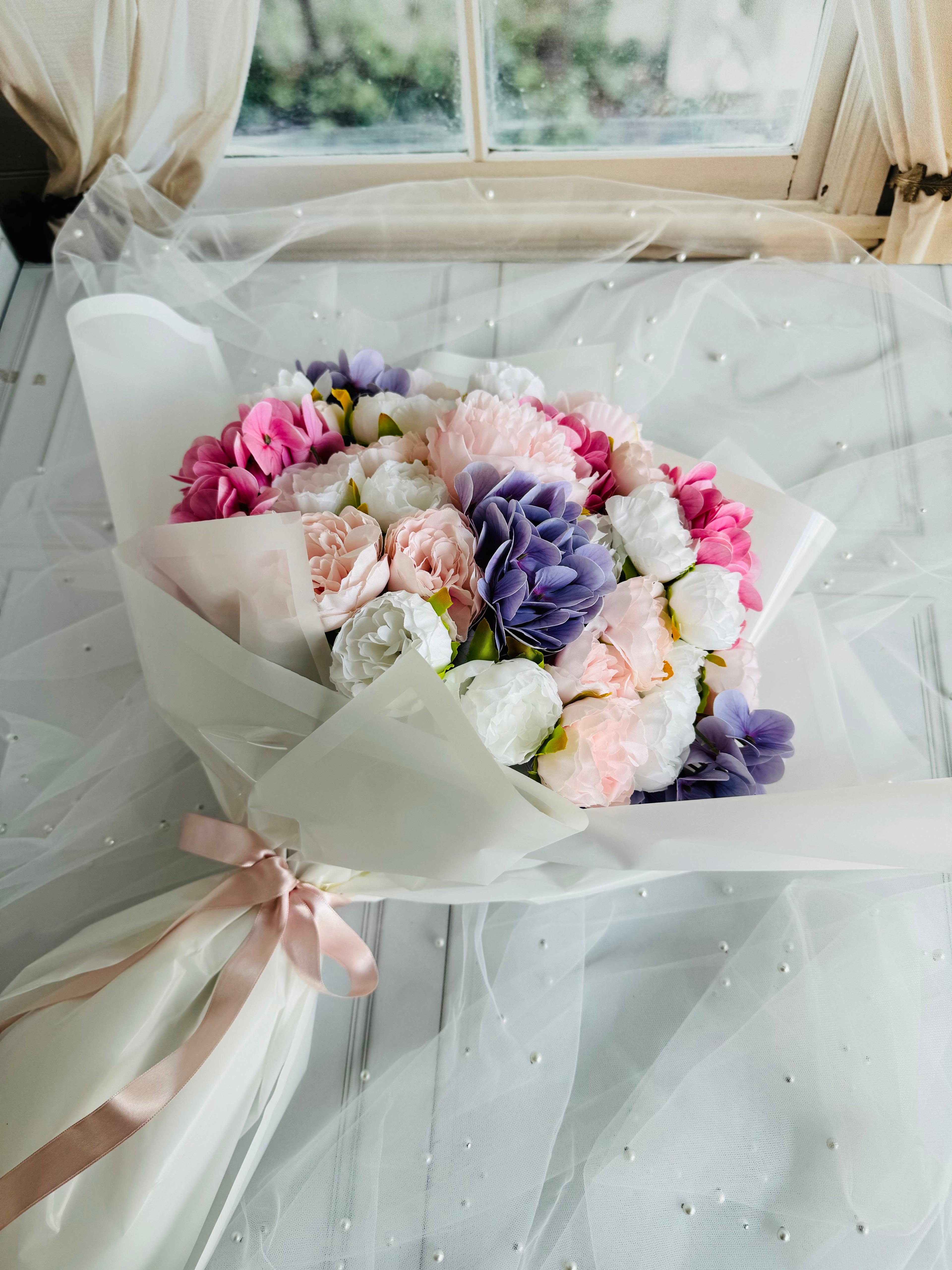 Zarafetin ve romantizmin buluştuğu özel tasarım ? Pastel tonlarıyla her anı masalsı bir zarafete dönüştürür. ? Büyük boydur . Islak dokulu ortanca ve kumaş şakayıktan oluşmaktadır. Teslim süresi 15-20 iş günüdür; acil tarihler için not kısmına belirtmeniz yeterlidir. ?Ürünlerimiz tamamen el yapımıdır; bu nedenle her buket ve süs benzersizdir. Çiçeklerin yerleşimi ve detayları ufak farklılıklar gösterebilir, bu da ürünlerimize özel bir karakter katar. ?