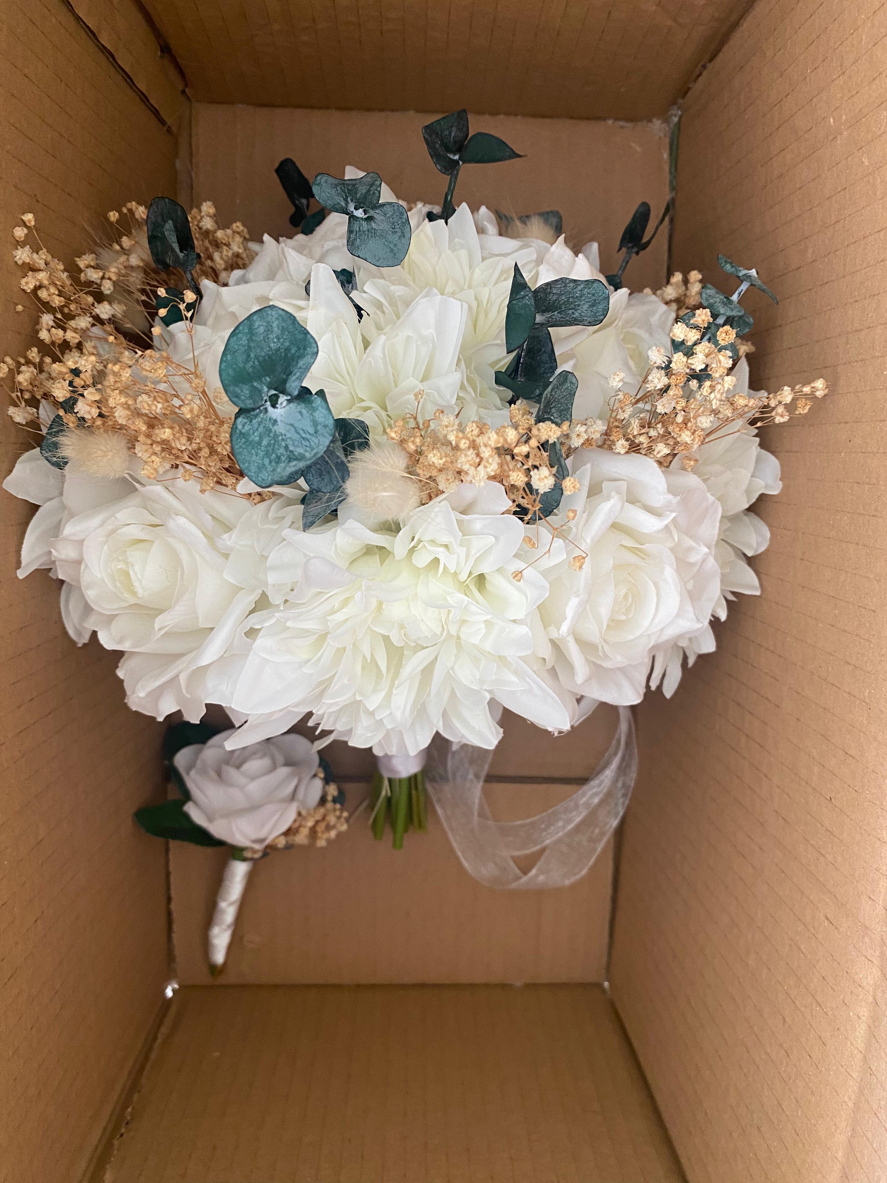 Beyaz çiçeklerin sade güzelliğine cipso detaylarının zarafeti eşlik ediyor. Modern ve temiz bir şıklık arayan gelinler için özenle hazırlandı.? Orta boydur ne büyük ne de küçük. Yaka çiçeği hediyedir. Teslim süresi 15-20 iş günüdür; acil tarihler için not kısmına belirtmeniz yeterlidir. ?Ürünlerimiz tamamen el yapımıdır; bu nedenle her buket ve süs benzersizdir. Çiçeklerin yerleşimi ve detayları ufak farklılıklar gösterebilir, bu da ürünlerimize özel bir karakter katar. ?