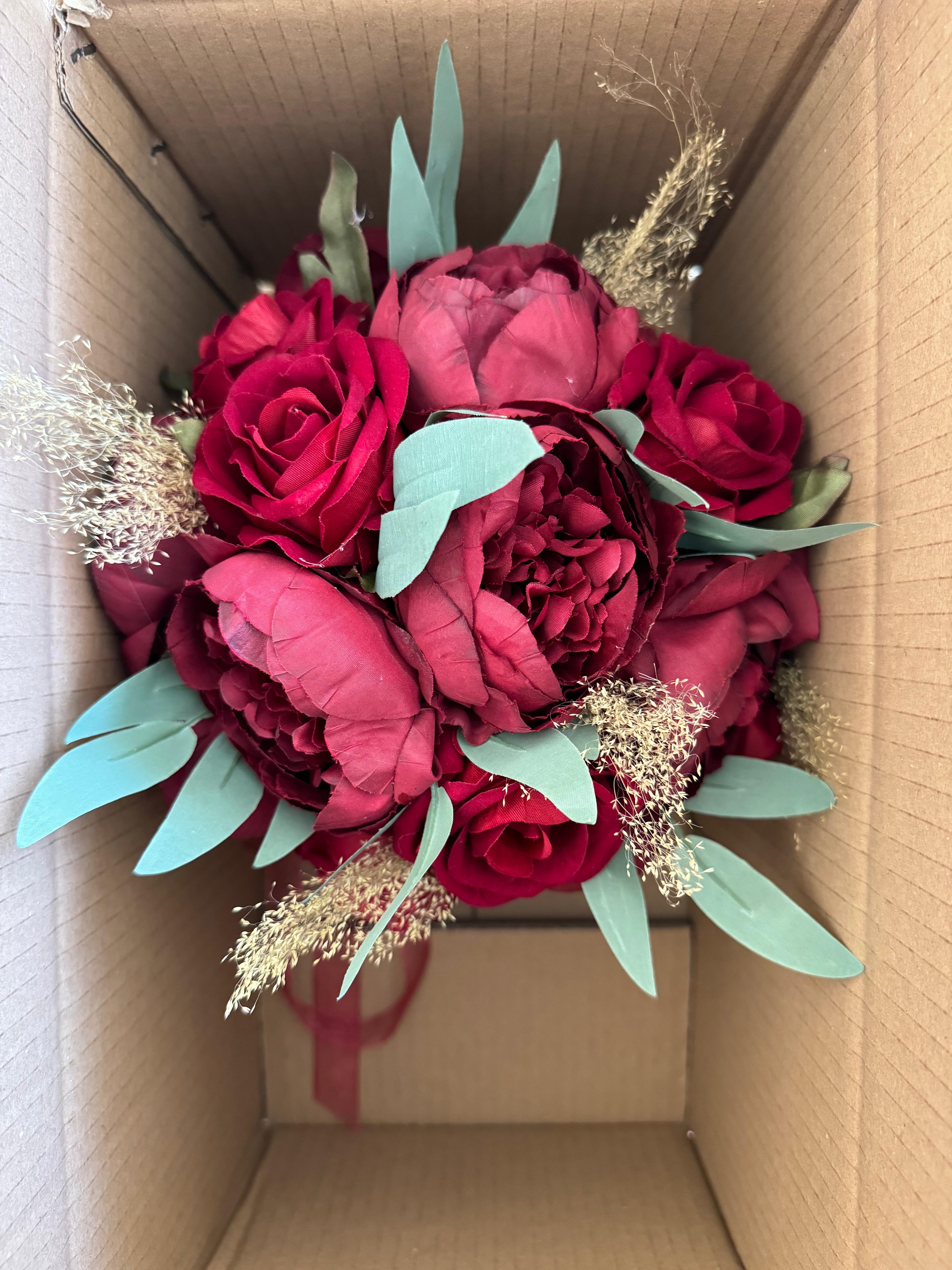 ✨ Kırmızı şakayıkların tutkulu dokusu,yeşil yaprakların zarafetiyle buluşarak güçlü ve romantik bir uyum sağladı. Özel günlerinizde unutulmaz bir etki bırakmak için tasarlandı.? Düğün veya nişan için uygundur. Birinci sınıf kalitedeki kumaş ve yapay çiçeklerden oluşmaktadır, ömürlüktür. Düğün veya nişan için uygundur. Yaka çiçeği hediyedir. Teslim süresi 15-20 iş günüdür; acil tarihler için not kısmına belirtmeniz yeterlidir. ?Ürünlerimiz tamamen el yapımıdır; bu nedenle her buket ve süs benzersizdir. Çiçeklerin yerleşimi ve detayları ufak farklılıklar gösterebilir, bu da ürünlerimize özel bir karakter katar. ?