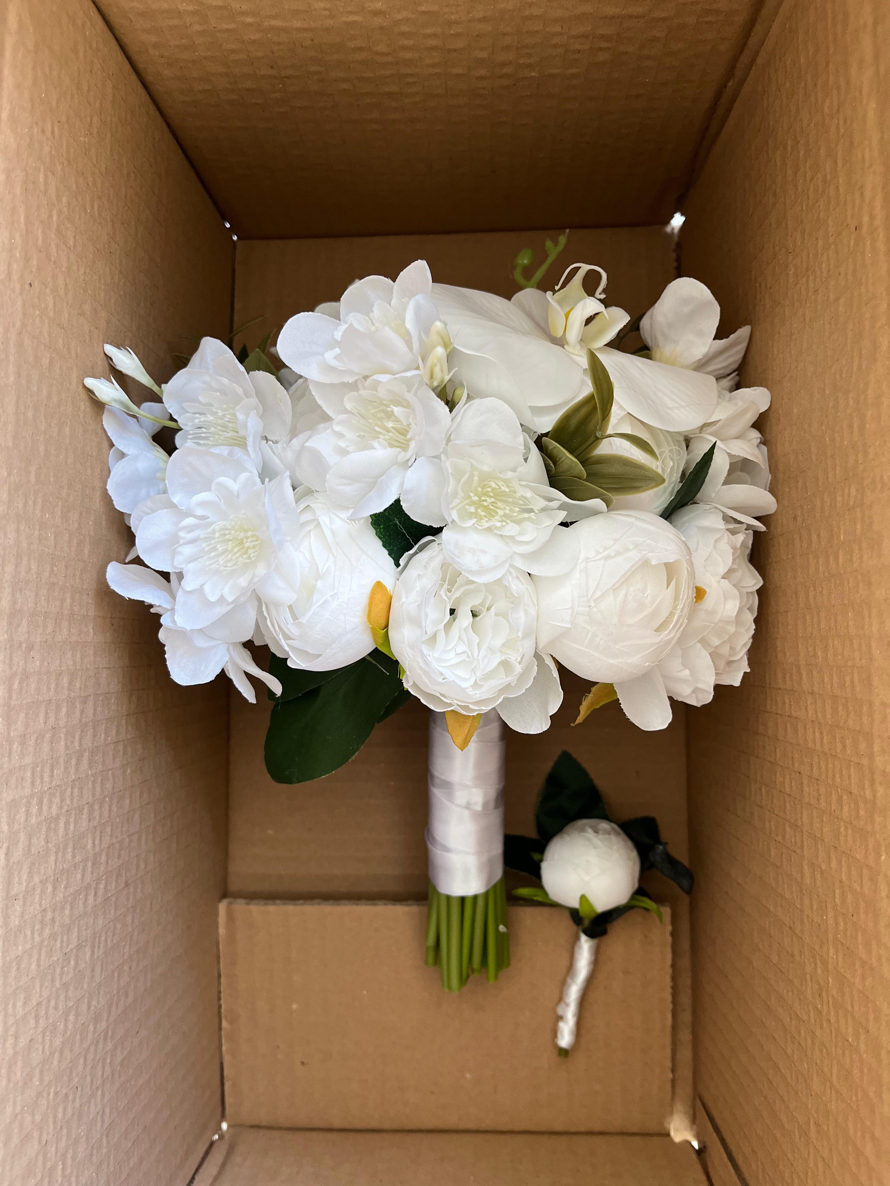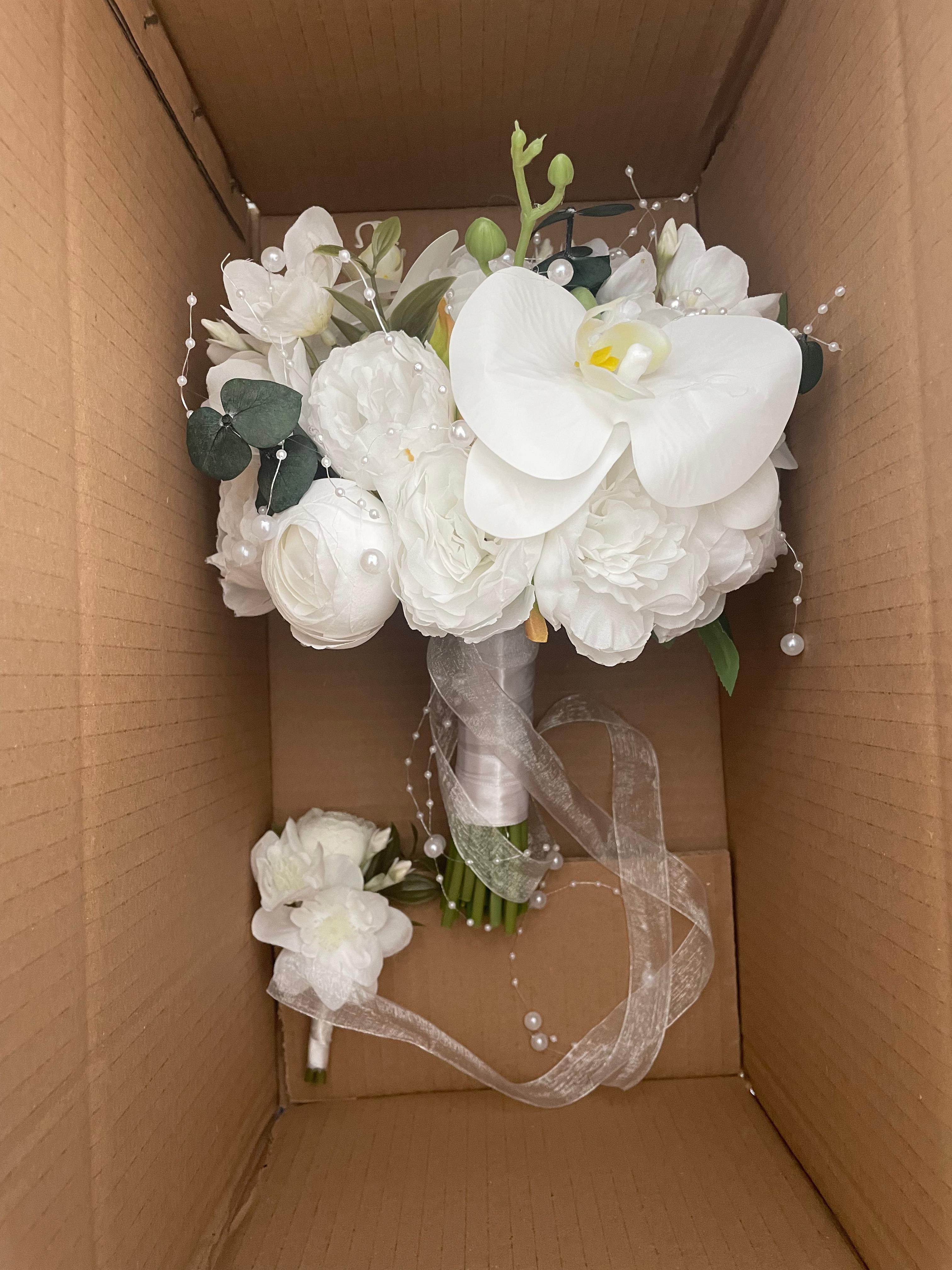 ✨ Beyaz orkidenin asil durusu ve yumuşak çiçek dokuları bu bukete modern bir zarafet kazandırıyor. Temiz, sade ve etkileyici görünümü ile düğün veya nişan için kusursuz bir seçimdir. Birinci sınıf kalitedeki kumaş çiçeklerden oluşmaktadır, ömürlüktür. Orta boydur ne büyük ne de küçük. Yaka çiçeği hediyedir. Teslim süresi 15-20 iş günüdür; acil tarihler için not kısmına belirtmeniz yeterlidir. ?Ürünlerimiz tamamen el yapımıdır; bu nedenle her buket ve süs benzersizdir. Çiçeklerin yerleşimi ve detayları ufak farklılıklar gösterebilir, bu da ürünlerimize özel bir karakter katar. ?
