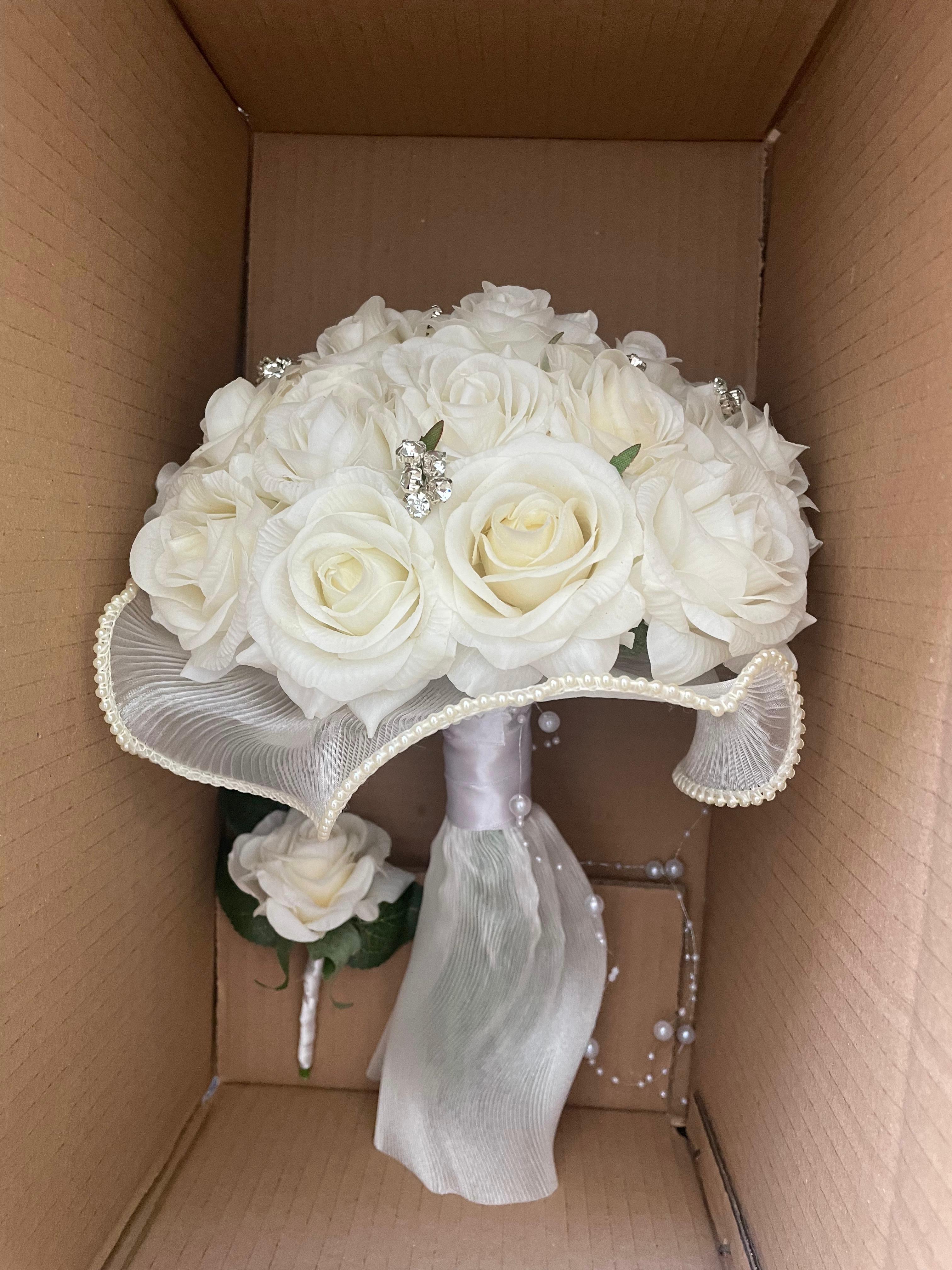 ✨Zarif ve şık tasarımıyla her gelinliğe uyum sağlar. Birinci sınıf kalitedeki yapay ıslak dokulu gülden oluşmaktadır. Orta boydur ne büyük ne de küçük. Yaka çiçeği hediyedir. Teslim süresi 15-20 iş günüdür; acil tarihler için not kısmına belirtmeniz yeterlidir. ?Ürünlerimiz tamamen el yapımıdır; bu nedenle her buket ve süs benzersizdir. Çiçeklerin yerleşimi ve detayları ufak farklılıklar gösterebilir, bu da ürünlerimize özel bir karakter katar. ?