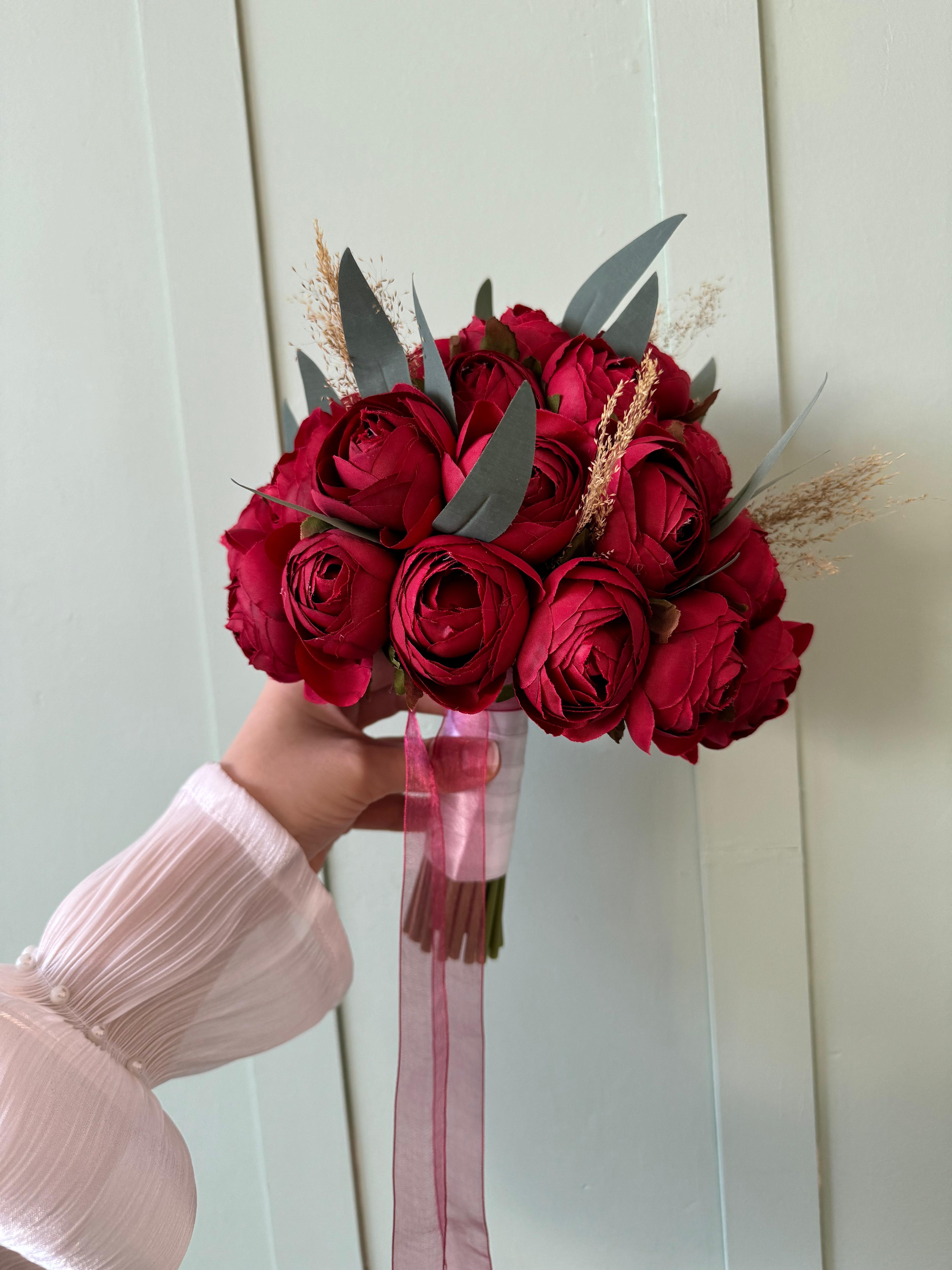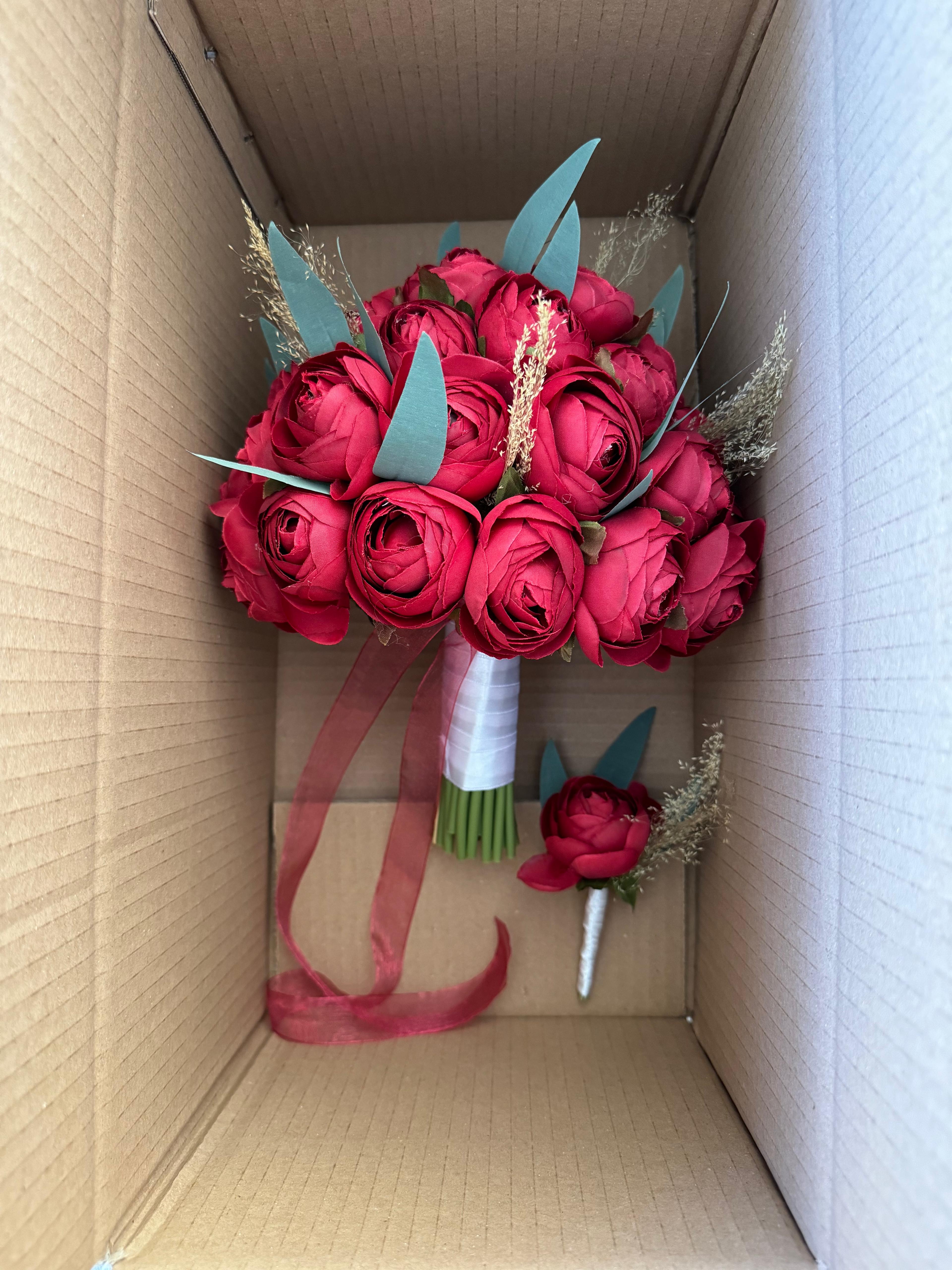 ✨ Kırmızı şakayıkların tutkulu dokusu,yeşil yaprakların zarafetiyle buluşarak güçlü ve romantik bir uyum sağladı. Özel günlerinizde unutulmaz bir etki bırakmak için tasarlandı.? Düğün veya nişan için uygundur. Birinci sınıf kalitedeki kumaş ve yapay çiçeklerden oluşmaktadır, ömürlüktür. Düğün veya nişan için uygundur. Yaka çiçeği hediyedir. Teslim süresi 15-20 iş günüdür; acil tarihler için not kısmına belirtmeniz yeterlidir. ?Ürünlerimiz tamamen el yapımıdır; bu nedenle her buket ve süs benzersizdir. Çiçeklerin yerleşimi ve detayları ufak farklılıklar gösterebilir, bu da ürünlerimize özel bir karakter katar. ?