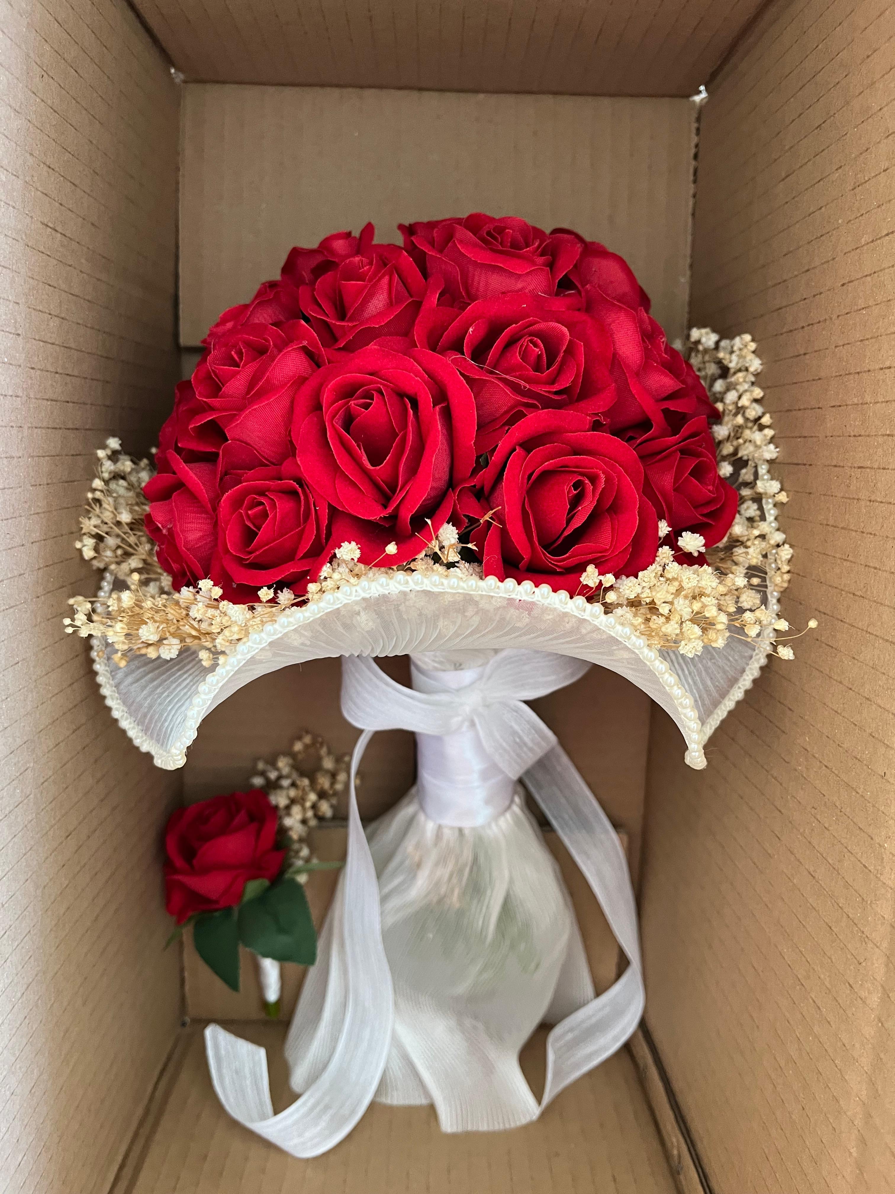 Kırmızı çiçeklerin tutkulu uyumu cipsoların zarif duruşuyla buluşuyor. Güçlü, şık ve etkileyici duruşuyla her anınıza unutulmaz bir asalet katmak için özenle tasarlandı.? Düğün veya nişan için uygundur. Yaka çiçeği hediyedir. Teslim süresi 15-20 iş günüdür; acil tarihler için not kısmına belirtmeniz yeterlidir. ?Ürünlerimiz tamamen el yapımıdır; bu nedenle her buket ve süs benzersizdir. Çiçeklerin yerleşimi ve detayları ufak farklılıklar gösterebilir, bu da ürünlerimize özel bir karakter katar. ?