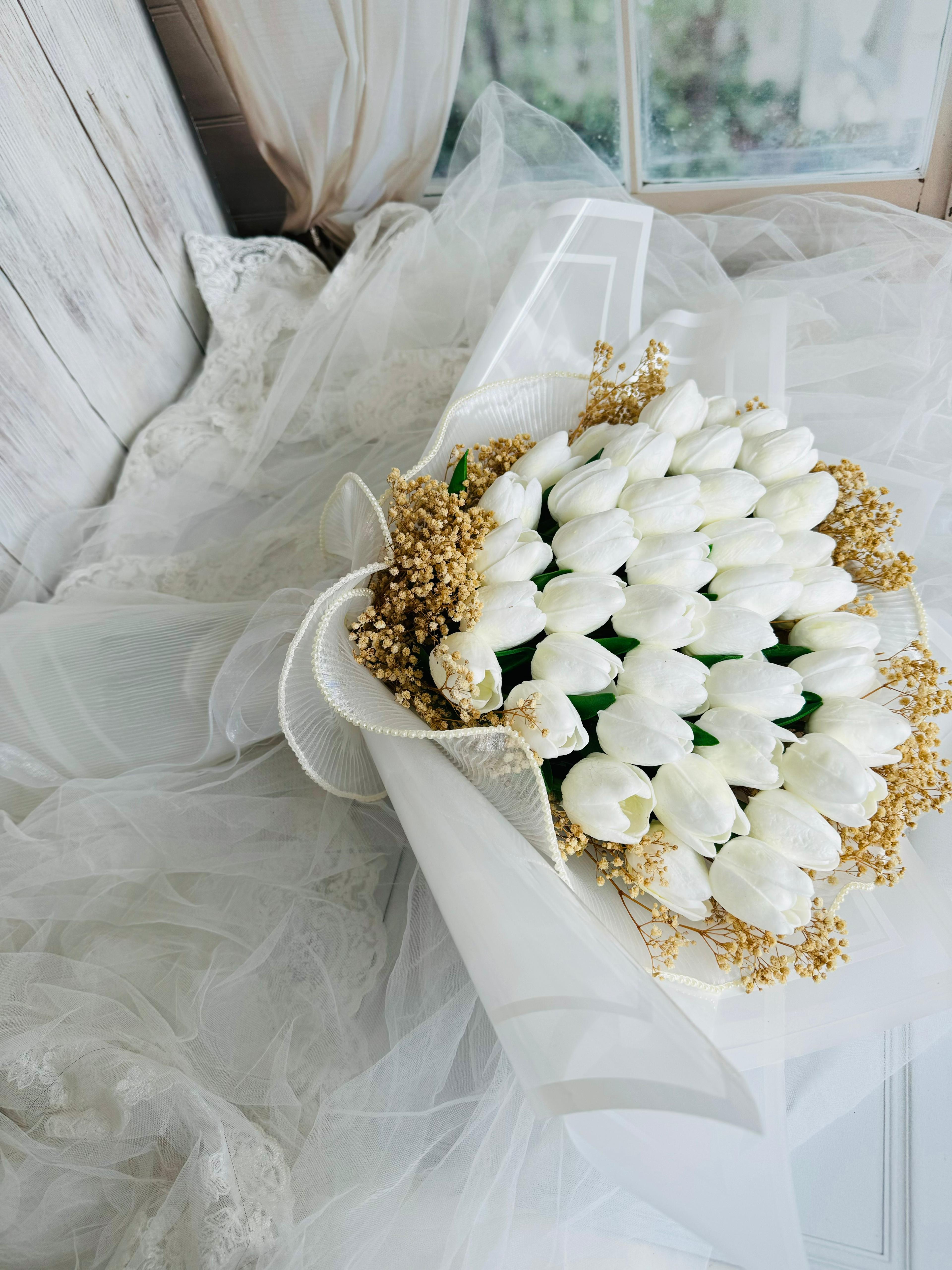 ?Beyaz lalelerin asaleti, cipsoların zarif dokunuşuyla birleşti. Sevginizi en saf haliyle anlatan özel bir isteme ve nişan buketi. 41 adet yapay ıslak laleden oluşuyor. Teslim süresi 15-20 iş günüdür; acil tarihler için not kısmına belirtmeniz yeterlidir. Ürünlerimiz tamamen el yapımıdır; bu nedenle her buket ve süs benzersizdir. Çiçeklerin yerleşimi ve detayları ufak farklılıklar gösterebilir, bu da ürünlerimize özel bir karakter katar. ?