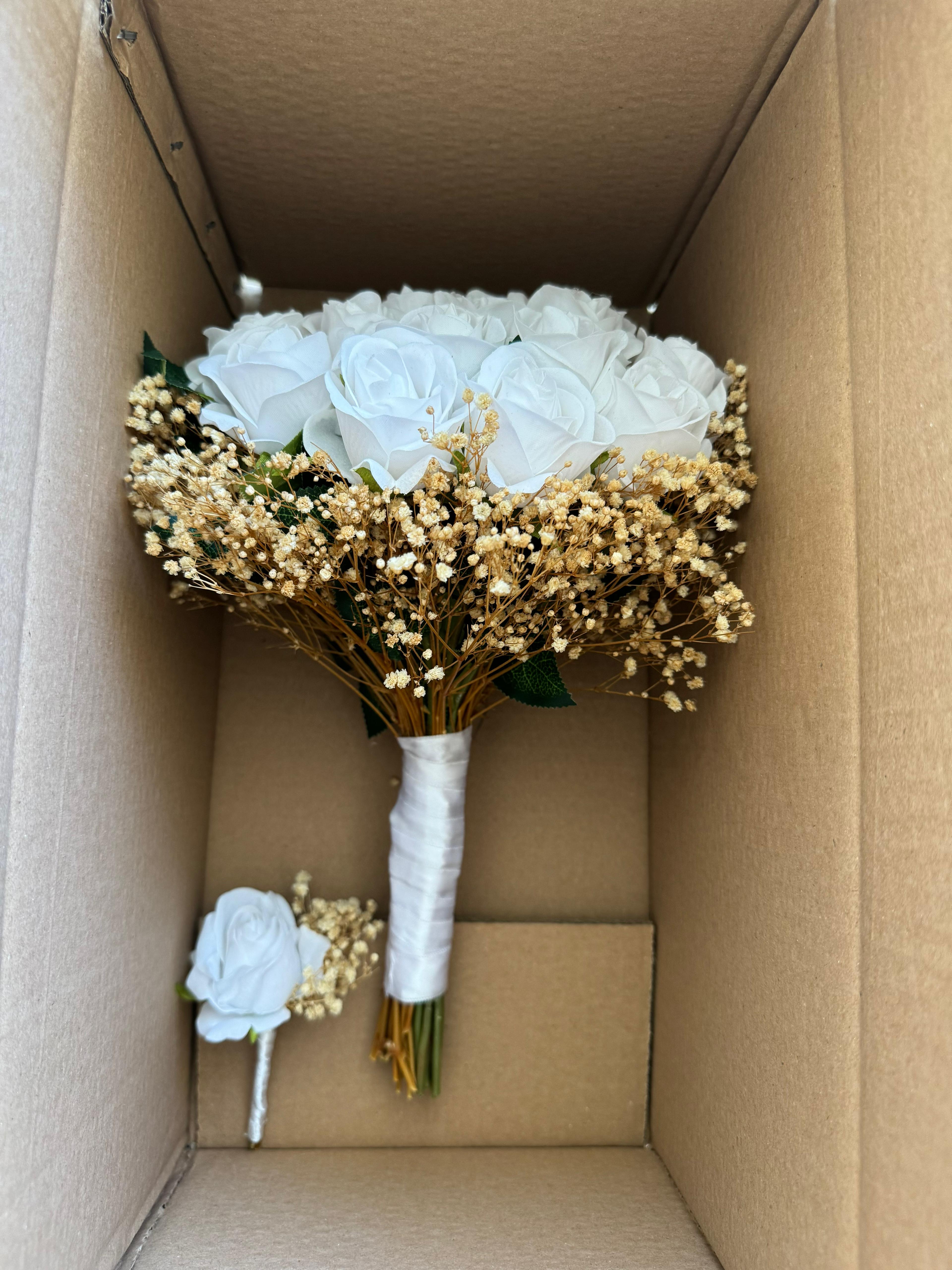 Beyaz güllerin sade zarafeti, cipsolar ile birleşerek sofistike bir görünüm sundu. Temiz, minimal bir gelin buket arayanlar için ideal seçimdir.? Orta boydur ne büyük ne de küçük. Yaka çiçeği hediyedir. Teslim süresi 15-20 iş günüdür; acil tarihler için not kısmına belirtmeniz yeterlidir. ?Ürünlerimiz tamamen el yapımıdır; bu nedenle her buket ve süs benzersizdir. Çiçeklerin yerleşimi ve detayları ufak farklılıklar gösterebilir, bu da ürünlerimize özel bir karakter katar. ?