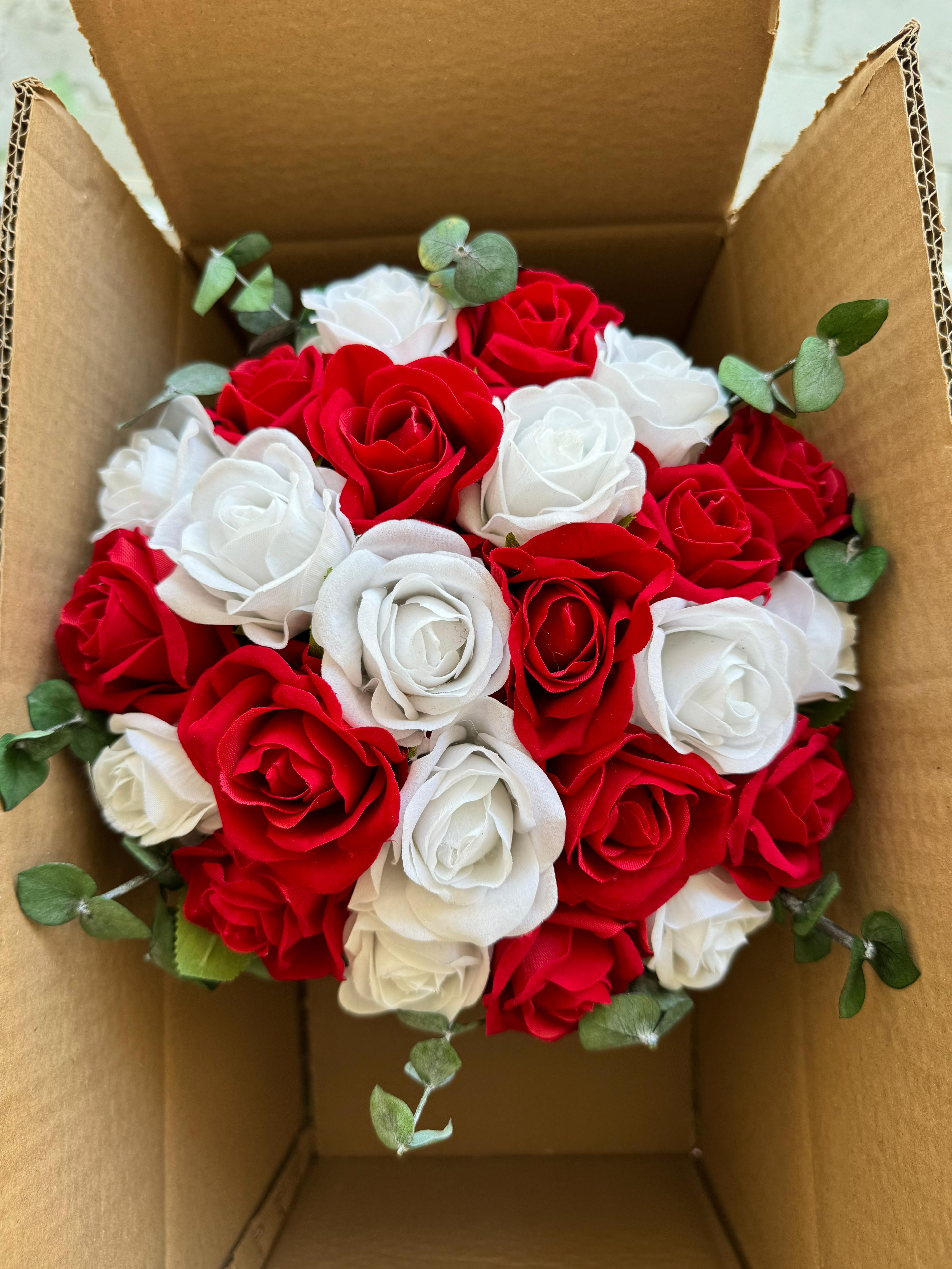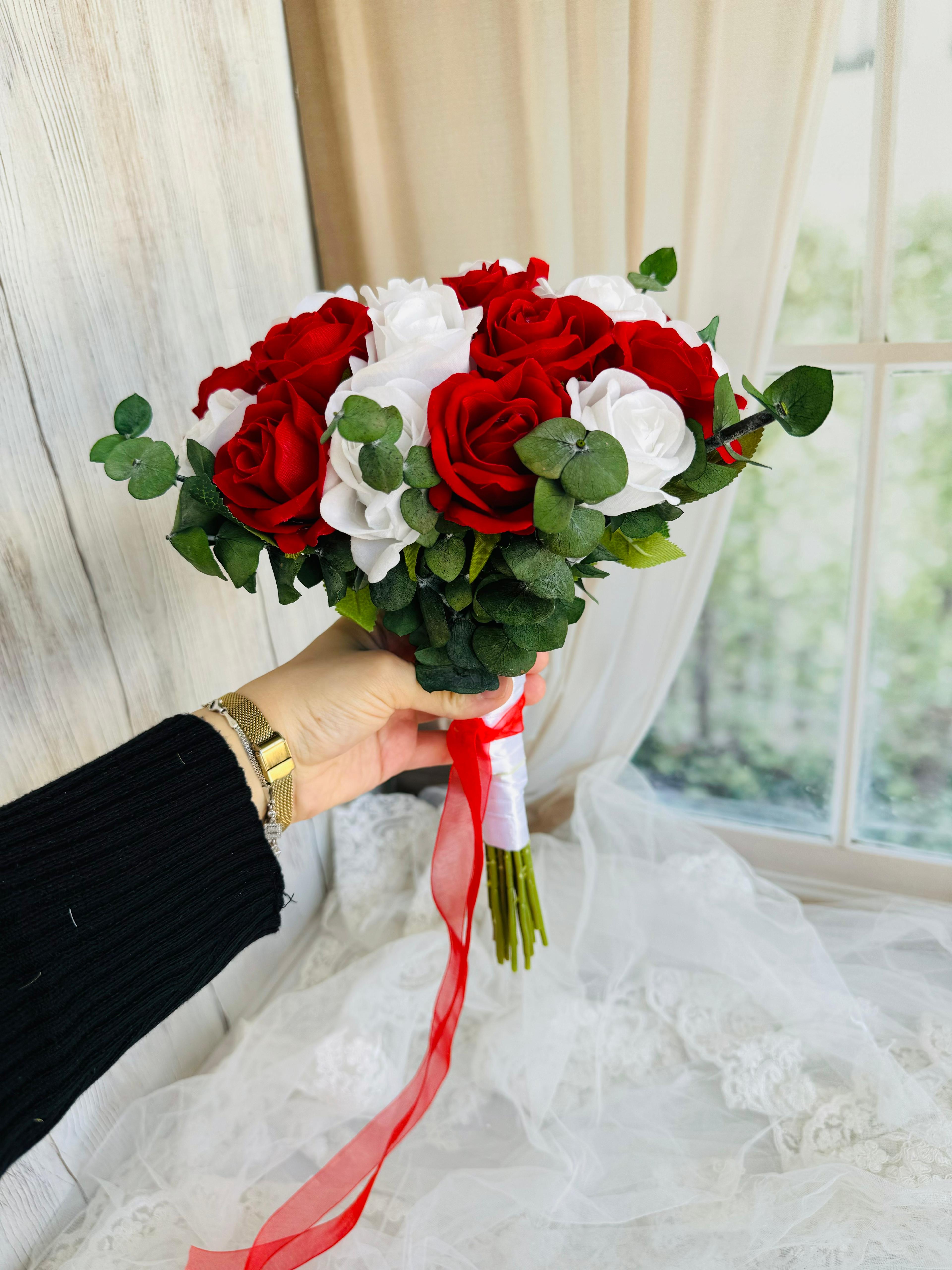Kırmızı kadife güllerin derin tonları ve beyaz güllerin yumuşak dokusuyla tasarlanan bu buket, özel gününüze zarafet ve romantizmin en özel halini taşır.? Düğün veya nişan için uygundur. Orta boydur ne büyük ne de küçük. Yaka çiçeği hediyedir. Teslim süresi 15-20 iş günüdür; acil tarihler için not kısmına belirtmeniz yeterlidir. ?Ürünlerimiz tamamen el yapımıdır; bu nedenle her buket ve süs benzersizdir. Çiçeklerin yerleşimi ve detayları ufak farklılıklar gösterebilir, bu da ürünlerimize özel bir karakter katar. ?