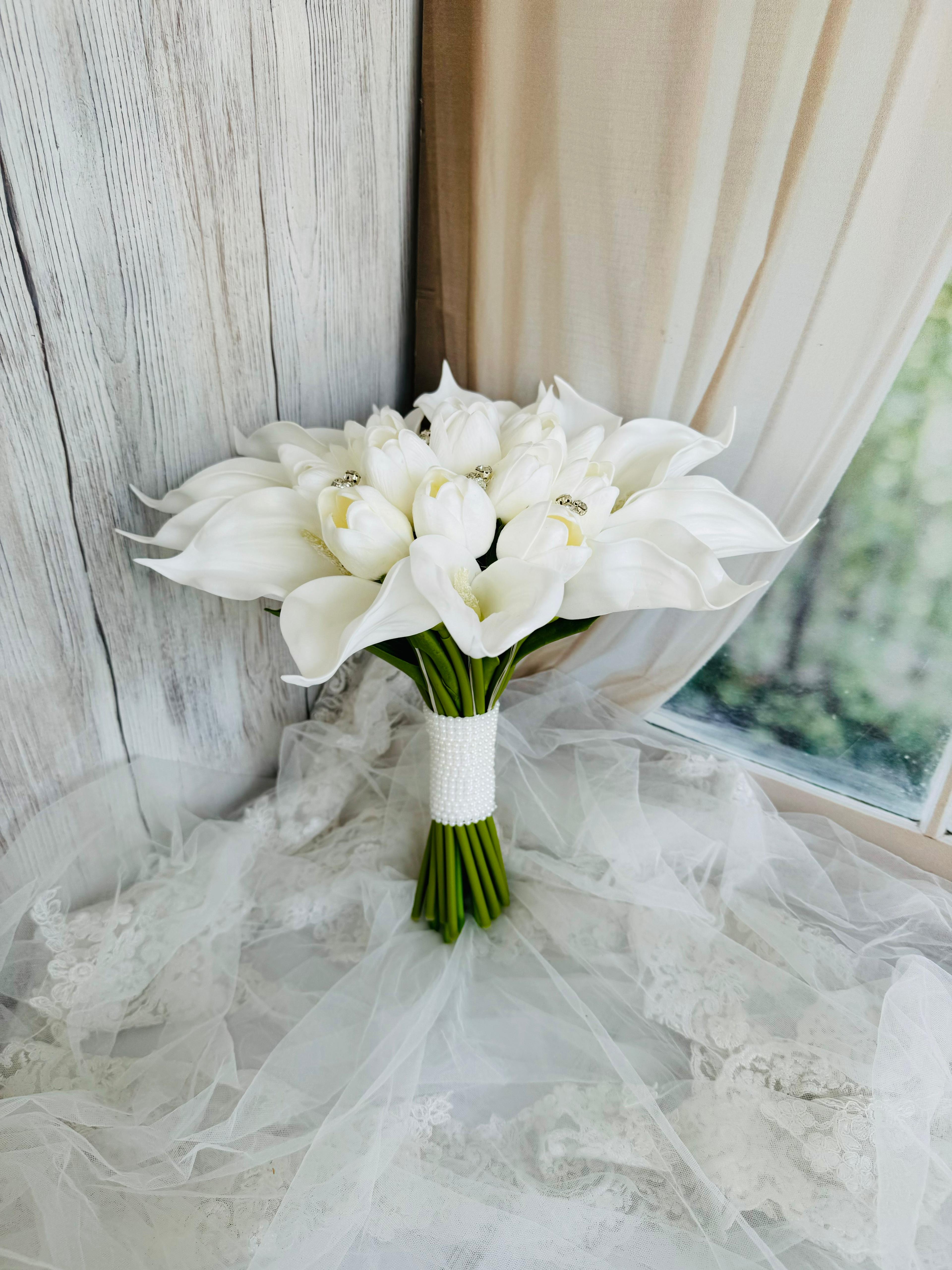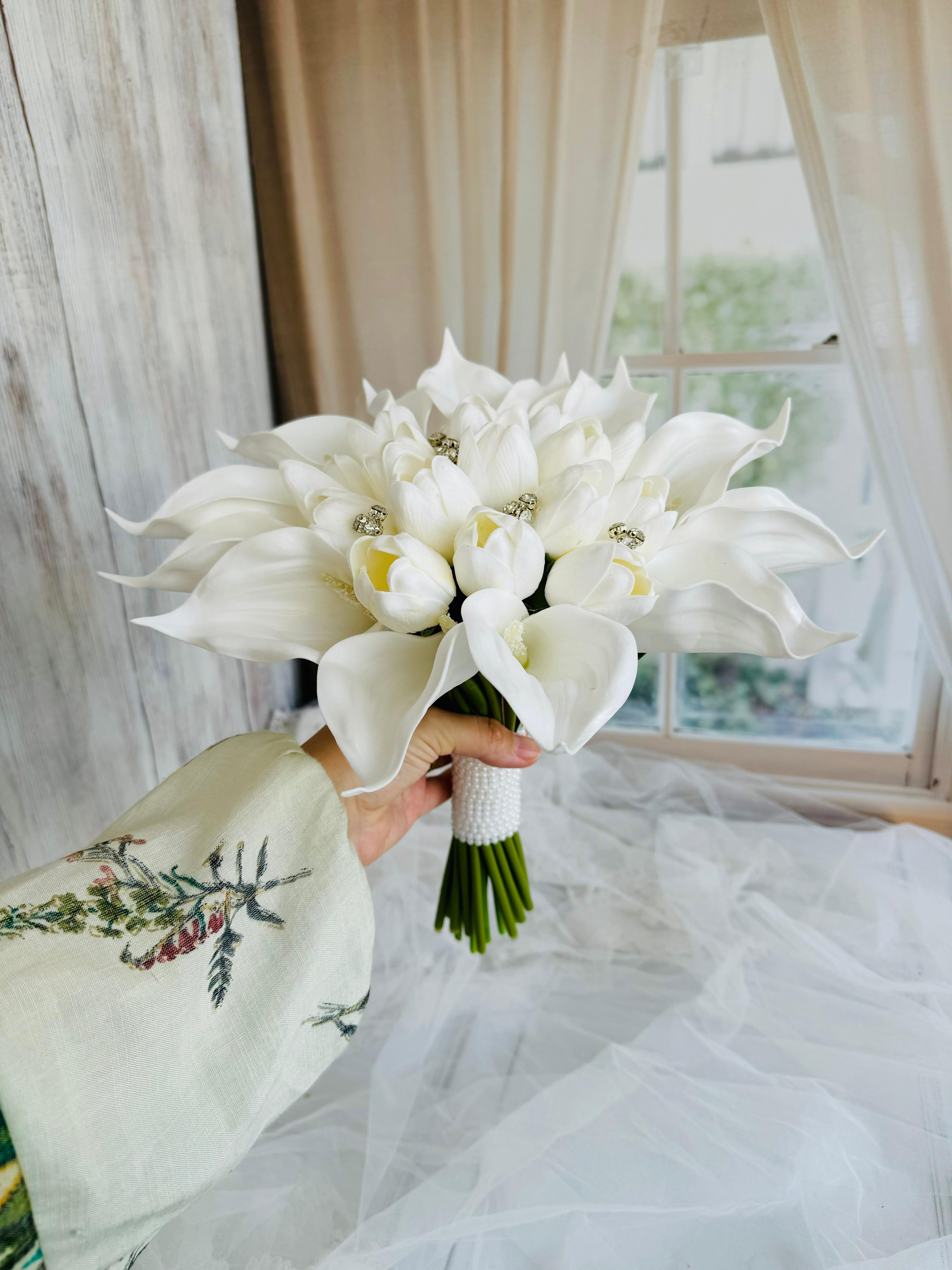 Şıklığı minimal dokunuşlarla taşıyan gelinler için tasarlandı. Işıltılı taş süslemeleri ve yumuşak tonlarıyla düğününüzde göz alıcı bir duruş sunar.? Orta boydur ne büyük ne de küçük. Yaka çiçeği hediyedir. Teslim süresi 15-20 iş günüdür; acil tarihler için not kısmına belirtmeniz yeterlidir.? Ürünlerimiz tamamen el yapımıdır; bu nedenle her buket ve süs benzersizdir. Çiçeklerin yerleşimi ve detayları ufak farklılıklar gösterebilir, bu da ürünlerimize özel bir karakter katar. ?