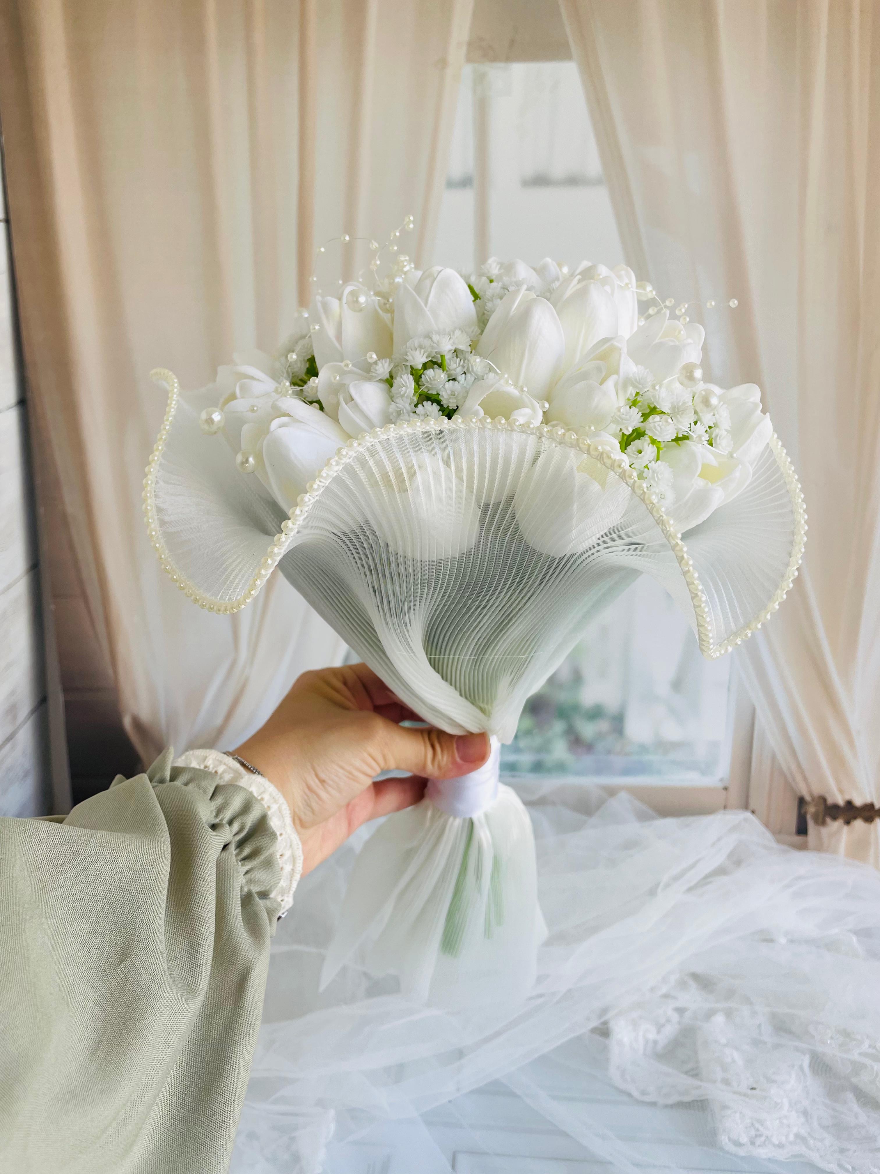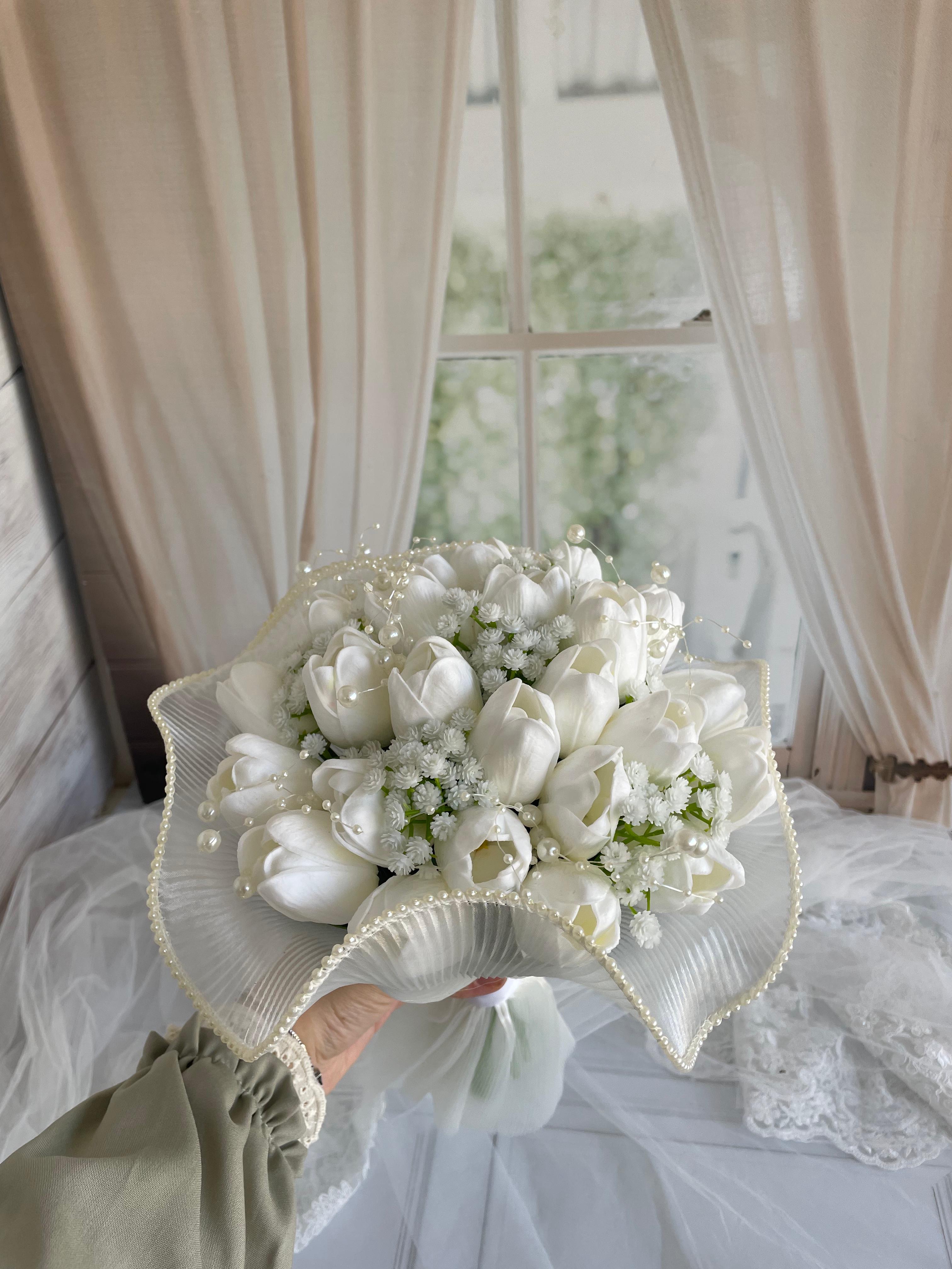 Beyaz lalelerin sade zarafeti, cipsolar ile birleşerek sofistike bir görünüm sundu. Temiz, minimal bir gelin buket arayanlar için ideal seçimdir.? Orta boydur ne büyük ne de küçük. Yaka çiçeği hediyedir. Teslim süresi 15-20 iş günüdür; acil tarihler için not kısmına belirtmeniz yeterlidir. ?Ürünlerimiz tamamen el yapımıdır; bu nedenle her buket ve süs benzersizdir. Çiçeklerin yerleşimi ve detayları ufak farklılıklar gösterebilir, bu da ürünlerimize özel bir karakter katar. ?