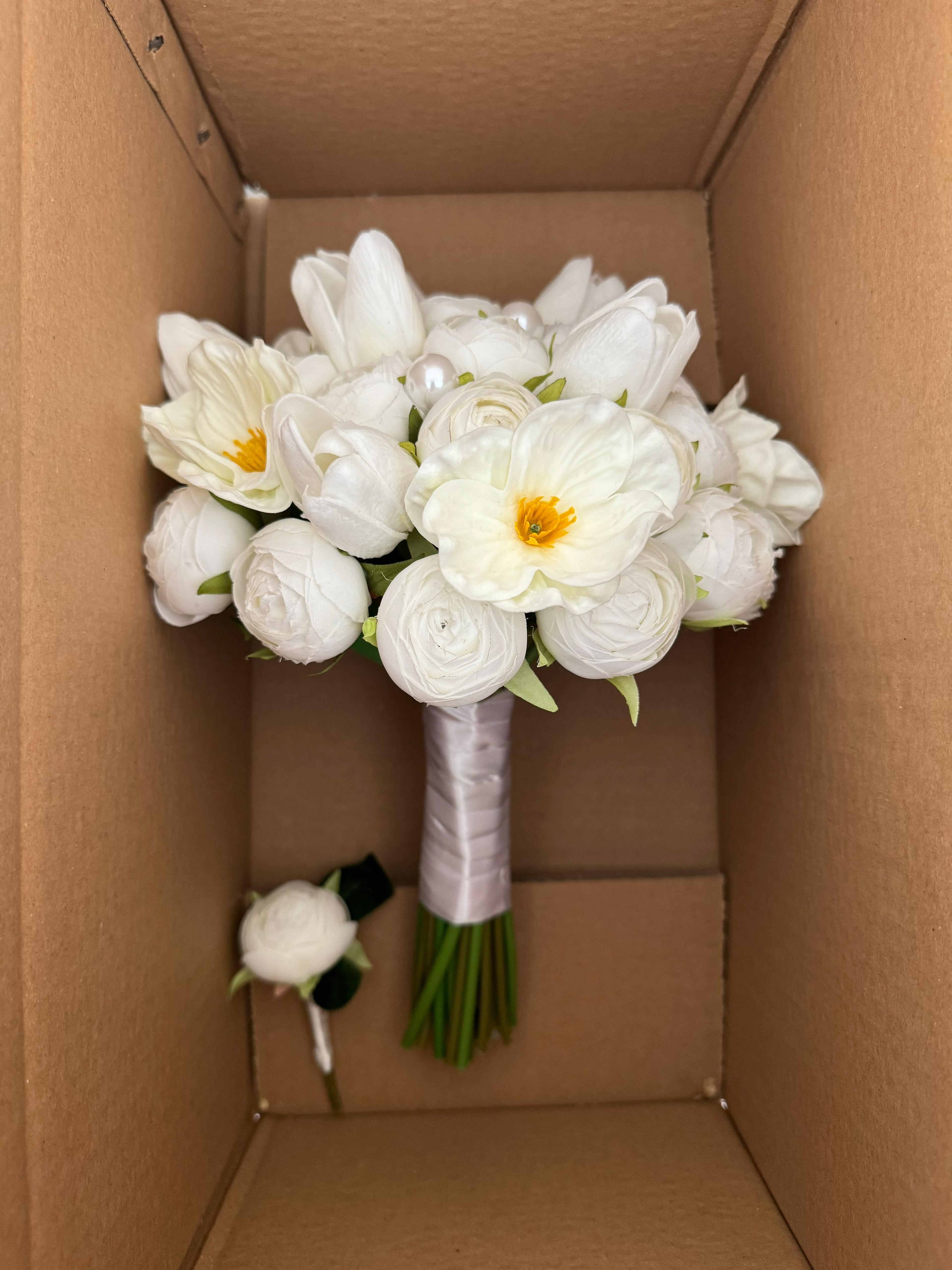 ?Gerçek çiçek görünümündeki birinci sınıf kumaş çiçekler ile hazırlanmıştır. Orta boydur ne büyük ne de küçük . Yaka çiçeği hediyedir. Teslim süresi 15-20 iş günüdür; acil tarihler için not kısmına belirtmeniz yeterlidir.? ?Ürünlerimiz tamamen el yapımıdır; bu nedenle her buket ve süs benzersizdir. Çiçeklerin yerleşimi ve detayları ufak farklılıklar gösterebilir, bu da ürünlerimize özel bir karakter katar. ?