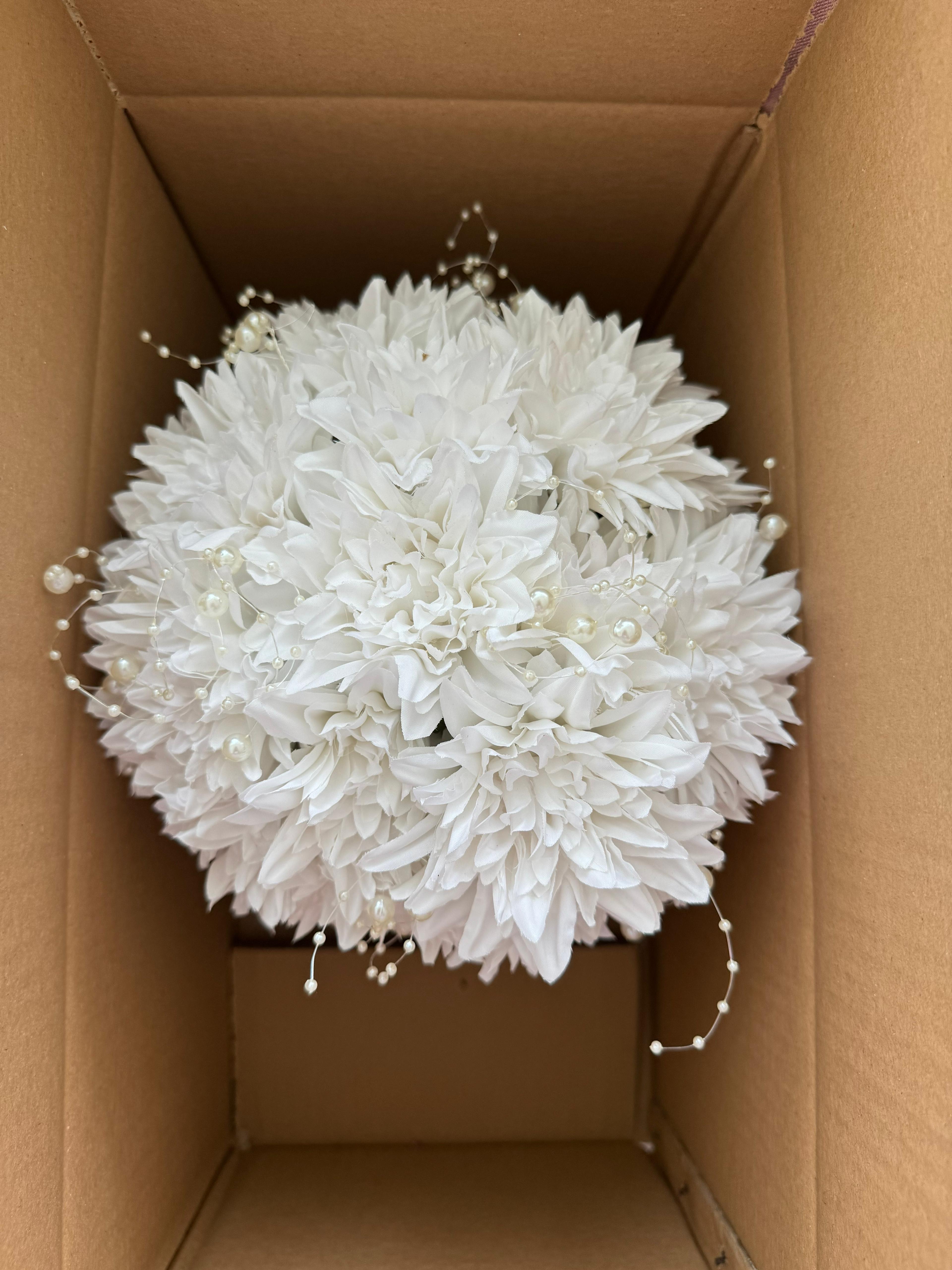 ?Beyaz krizantemlerin zarif duruşuyla hazırlanmış bu özel gelin buketi, sade güzelliğiyle dikkat çeker. Doğallığı ve şıklığı bir arada sunan tasarımıyla, özel gününüzde zarafetin en güzel halini taşıyın.? Orta boydur ne büyük ne de küçük. Yaka çiçeği hediyedir. Teslim süresi 15-20 iş günüdür; acil tarihler için not kısmına belirtmeniz yeterlidir. Ürünlerimiz tamamen el yapımıdır; bu nedenle her buket ve süs benzersizdir. Çiçeklerin yerleşimi ve detayları ufak farklılıklar gösterebilir, bu da ürünlerimize özel bir karakter katar. ?