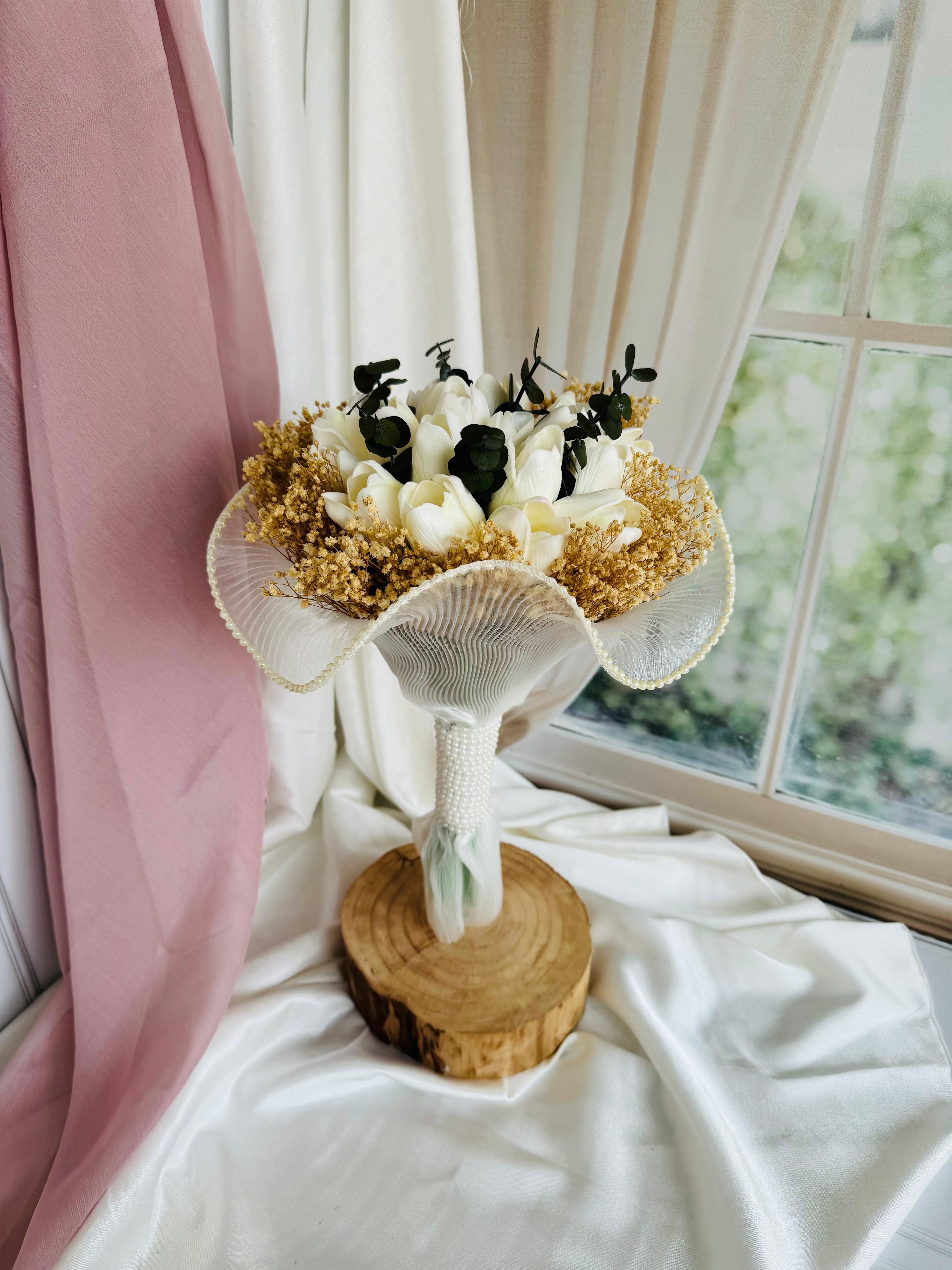 Beyaz lalelerin sade zarafeti, cipsolar ile birleşerek sofistike bir görünüm sundu. Temiz, minimal bir gelin buket arayanlar için ideal seçimdir.? Orta boydur ne büyük ne de küçük. Yaka çiçeği hediyedir. Teslim süresi 15-20 iş günüdür; acil tarihler için not kısmına belirtmeniz yeterlidir. ?Ürünlerimiz tamamen el yapımıdır; bu nedenle her buket ve süs benzersizdir. Çiçeklerin yerleşimi ve detayları ufak farklılıklar gösterebilir, bu da ürünlerimize özel bir karakter katar. ?