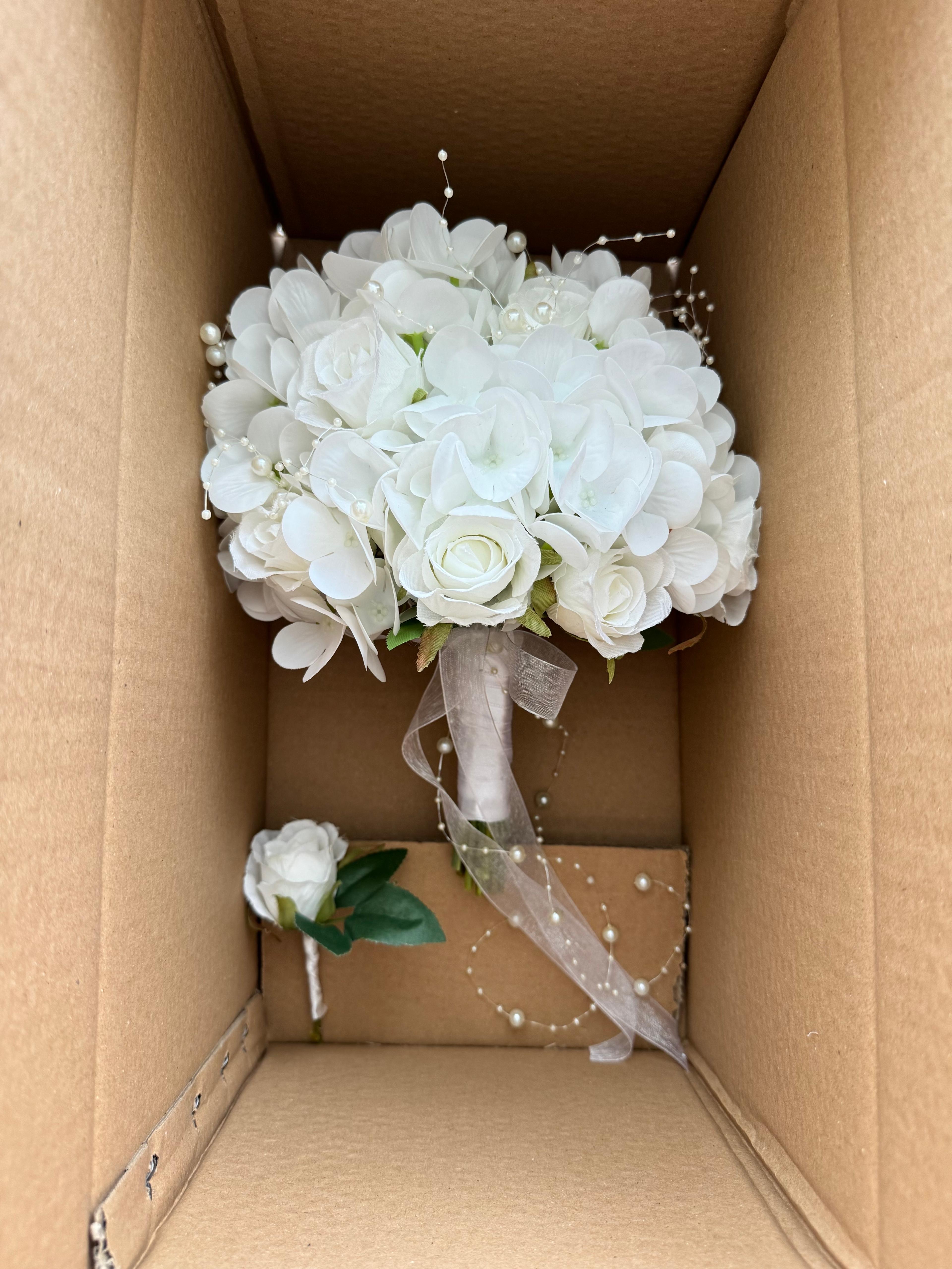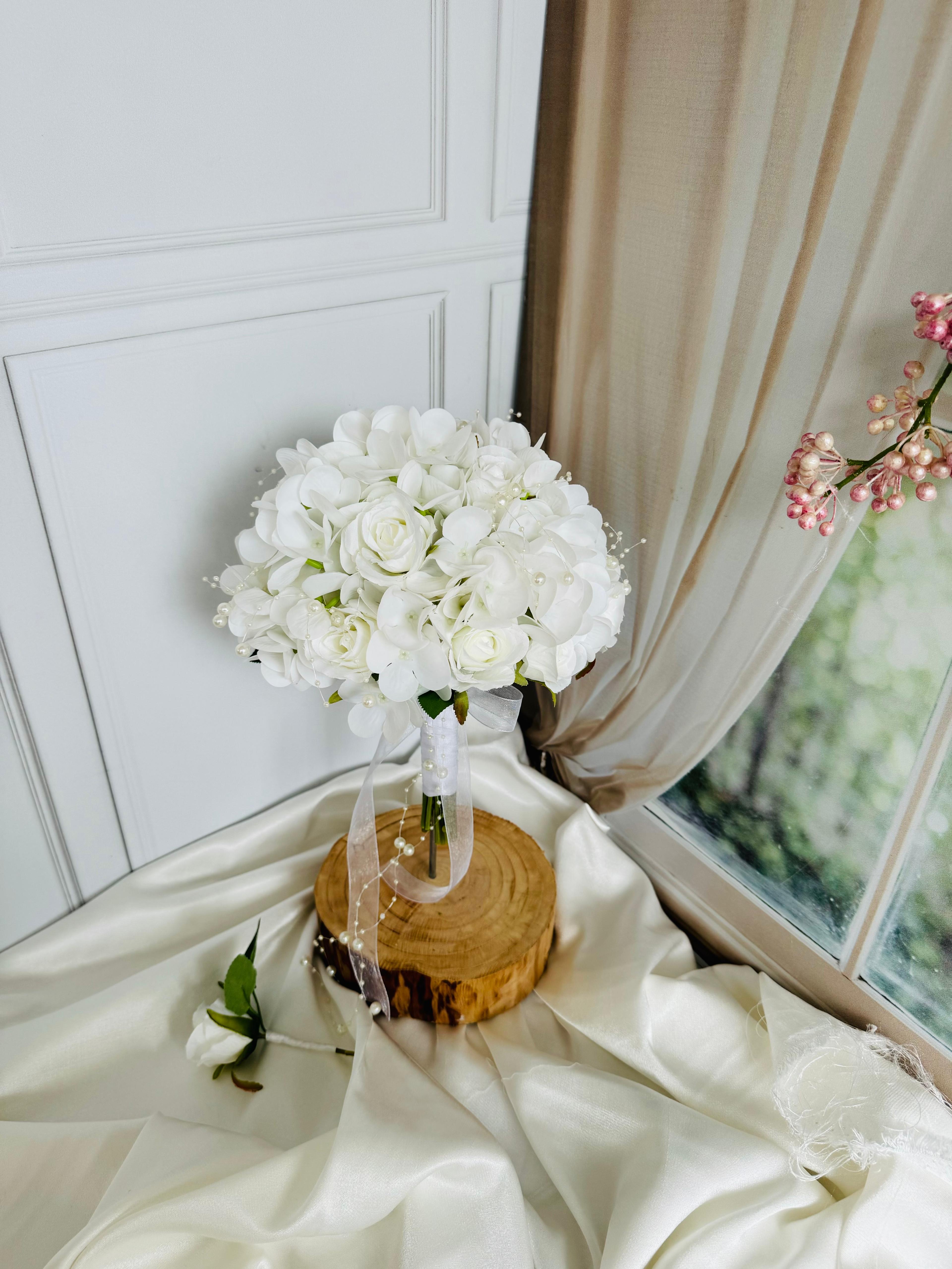 ?Gerçek çiçek görünümündeki birinci sınıf ıslak dokulu ortanca ve kumaş güller ile hazırlanmıştır. Zarif ve sade tasarımıyla her gelinliğe uyum sağlar. Orta boydur ne büyük ne de küçük . Yaka çiçeği hediyedir. Teslim süresi 15-20 iş günüdür; acil tarihler için not kısmına belirtmeniz yeterlidir.? Ürünlerimiz tamamen el yapımıdır; bu nedenle her buket ve süs benzersizdir. Çiçeklerin yerleşimi ve detayları ufak farklılıklar gösterebilir, bu da ürünlerimize özel bir karakter katar. ?