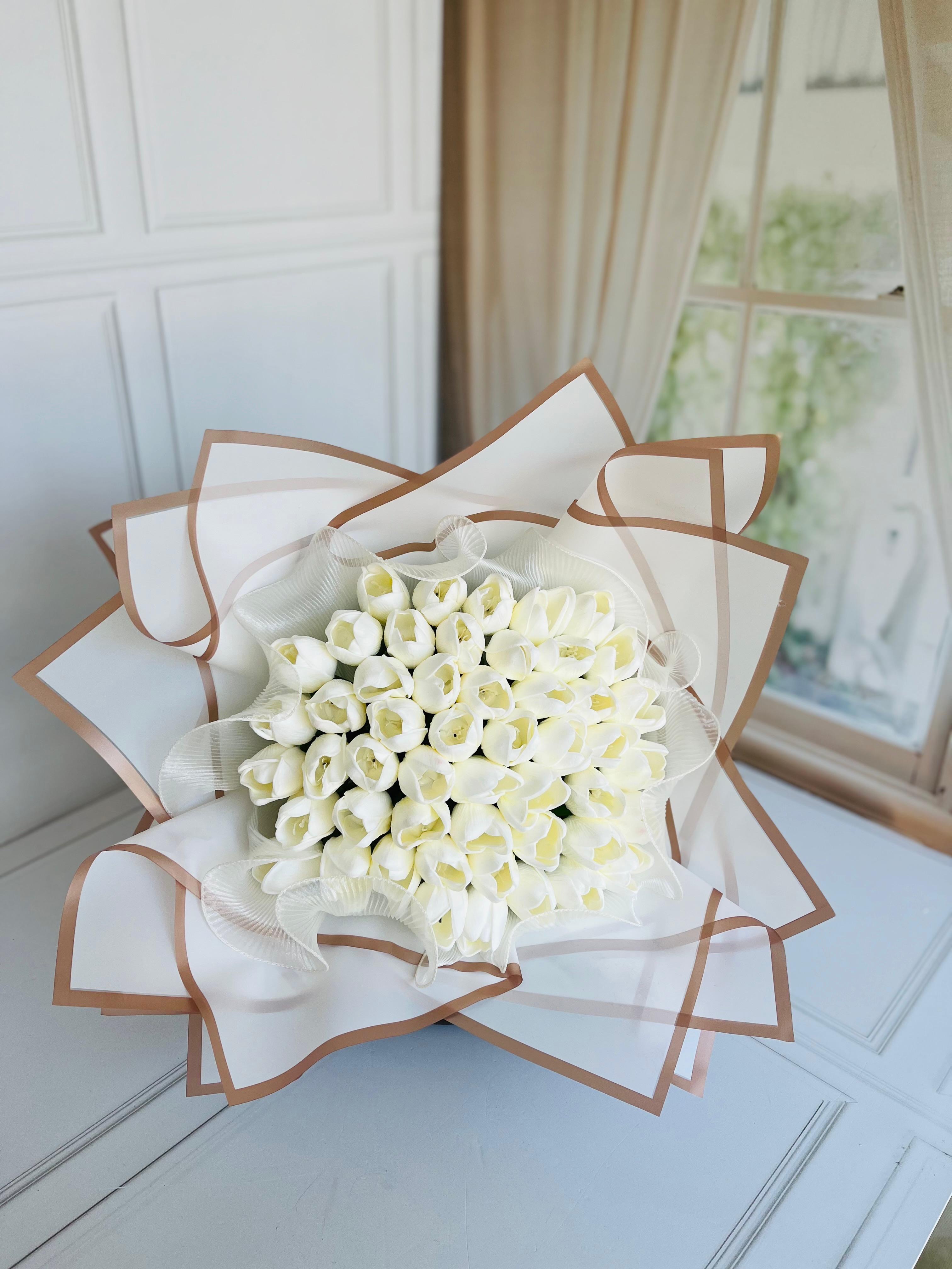 ?Beyaz lalelerin asaleti ile hazırlanan bu buket özel anlarınıza zarafet katar. Sevginizi en saf haliyle anlatan özel bir isteme ve nişan buketi. 50 adet yapay ıslak laleden oluşuyor. Teslim süresi 15-20 iş günüdür; acil tarihler için not kısmına belirtmeniz yeterlidir. Ürünlerimiz tamamen el yapımıdır; bu nedenle her buket ve süs benzersizdir. Çiçeklerin yerleşimi ve detayları ufak farklılıklar gösterebilir, bu da ürünlerimize özel bir karakter katar. ?