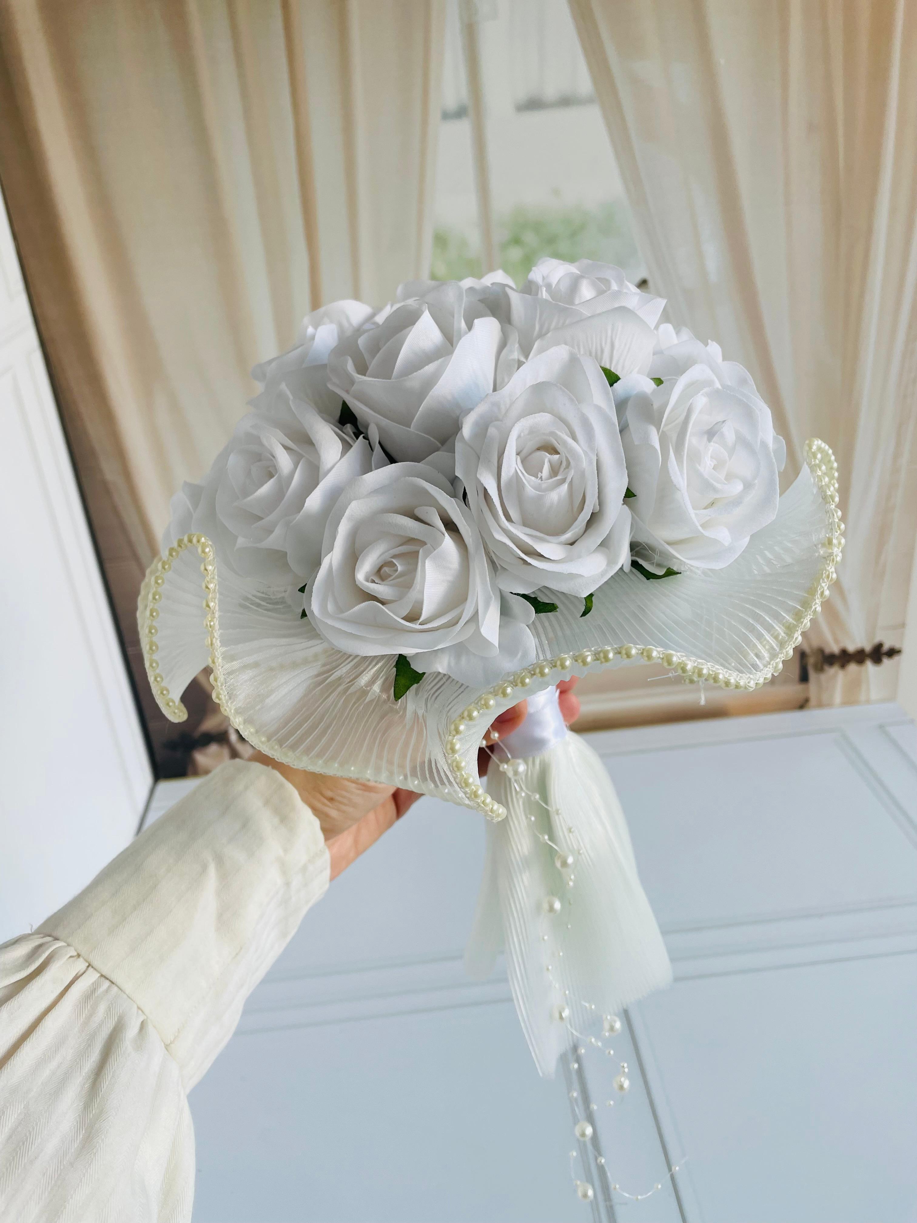 ?Minimal, zarif ve göz alıcı.. Beyaz güllerin masum dokunuşu, incili tülle birleşti. Sade ama etkileyici bir gelin stili arayanlar için tasarlandı.? Yaka çiçeği hediyedir. Orta boydur ne büyük ne de küçük. Teslim süresi 15-20 iş günüdür; acil tarihler için not kısmına belirtmeniz yeterlidir. ?Ürünlerimiz tamamen el yapımıdır; bu nedenle her buket ve süs benzersizdir. Çiçeklerin yerleşimi ve detayları ufak farklılıklar gösterebilir, bu da ürünlerimize özel bir karakter katar. ?