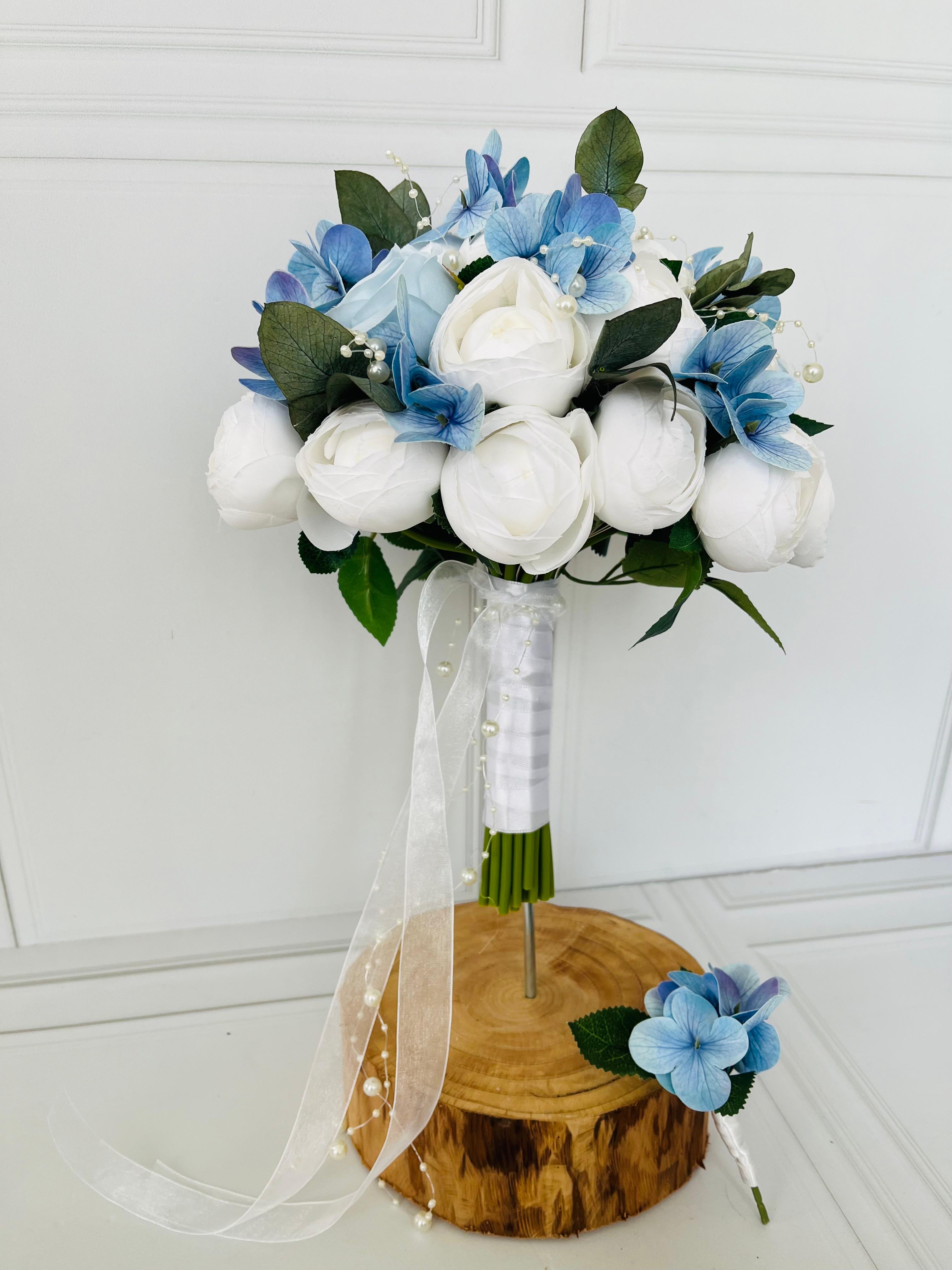 ?Birinci sınıf kalitedeki kumaş çiçeklerle hazırlanmış bu özel buket, mavi ve beyaz tonlarının uyumuyla ömürlük bir şıklık sunar. Özgün formu ile her detayı zarafet dolu bir tasarım.✨ Orta boydur ne büyük ne de küçük. Yaka çiçeği hediyedir. Teslim süresi 15-20 iş günüdür; acil tarihler için not kısmına belirtmeniz yeterlidir. ?Ürünlerimiz tamamen el yapımıdır; bu nedenle her buket ve süs benzersizdir. Çiçeklerin yerleşimi ve detayları ufak farklılıklar gösterebilir, bu da ürünlerimize özel bir karakter katar. ?