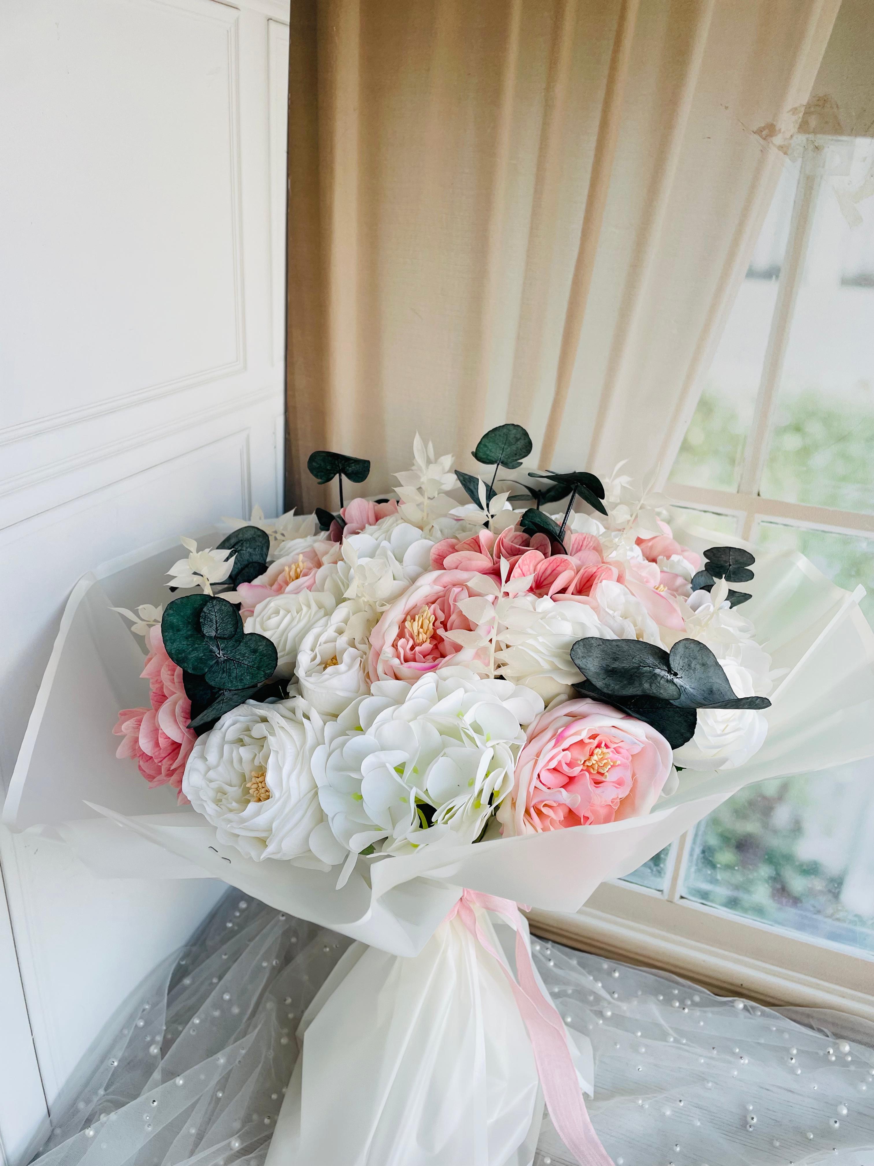 Tamamı ıslak dokulu çiçeklerin zarif uyumuyla hazırlanan bu isteme buketi, özel anlarınızı sade ve şık bir dokunuşla taçlandırır. ? Şakayık, gül ve ortancadan oluşuyor. Büyük boydur. Teslim süresi 15-20 iş günüdür; acil tarihler için not kısmına belirtmeniz yeterlidir. Ürünlerimiz tamamen el yapımıdır; bu nedenle her buket ve süs benzersizdir. Çiçeklerin yerleşimi ve detayları ufak farklılıklar gösterebilir, bu da ürünlerimize özel bir karakter katar. ?