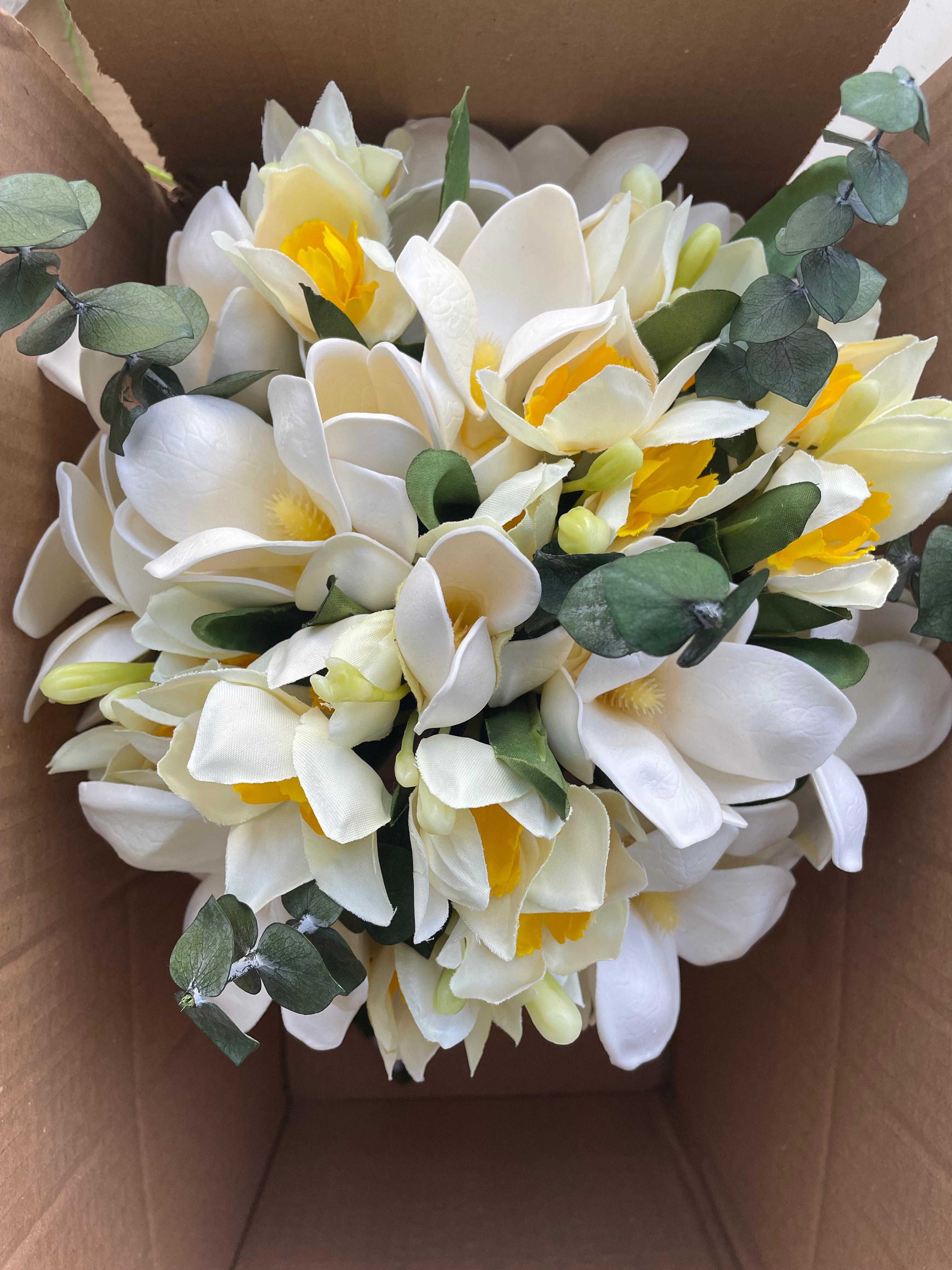 Nergislerin sıcak enerjisi, beyaz manolyaların zarif duruşuyla buluşuyor. Modern ve romantik çizgileri ile her anınıza sofistike bir ışıltı katmak için tasarlandı.? Düğün veya nişan için uygundur. Orta boydur ne büyük ne de küçük. Yaka çiçeği hediyedir. Teslim süresi 15-20 iş günüdür; acil tarihler için not kısmına belirtmeniz yeterlidir. ?Ürünlerimiz tamamen el yapımıdır; bu nedenle her buket ve süs benzersizdir. Çiçeklerin yerleşimi ve detayları ufak farklılıklar gösterebilir, bu da ürünlerimize özel bir karakter katar. ?