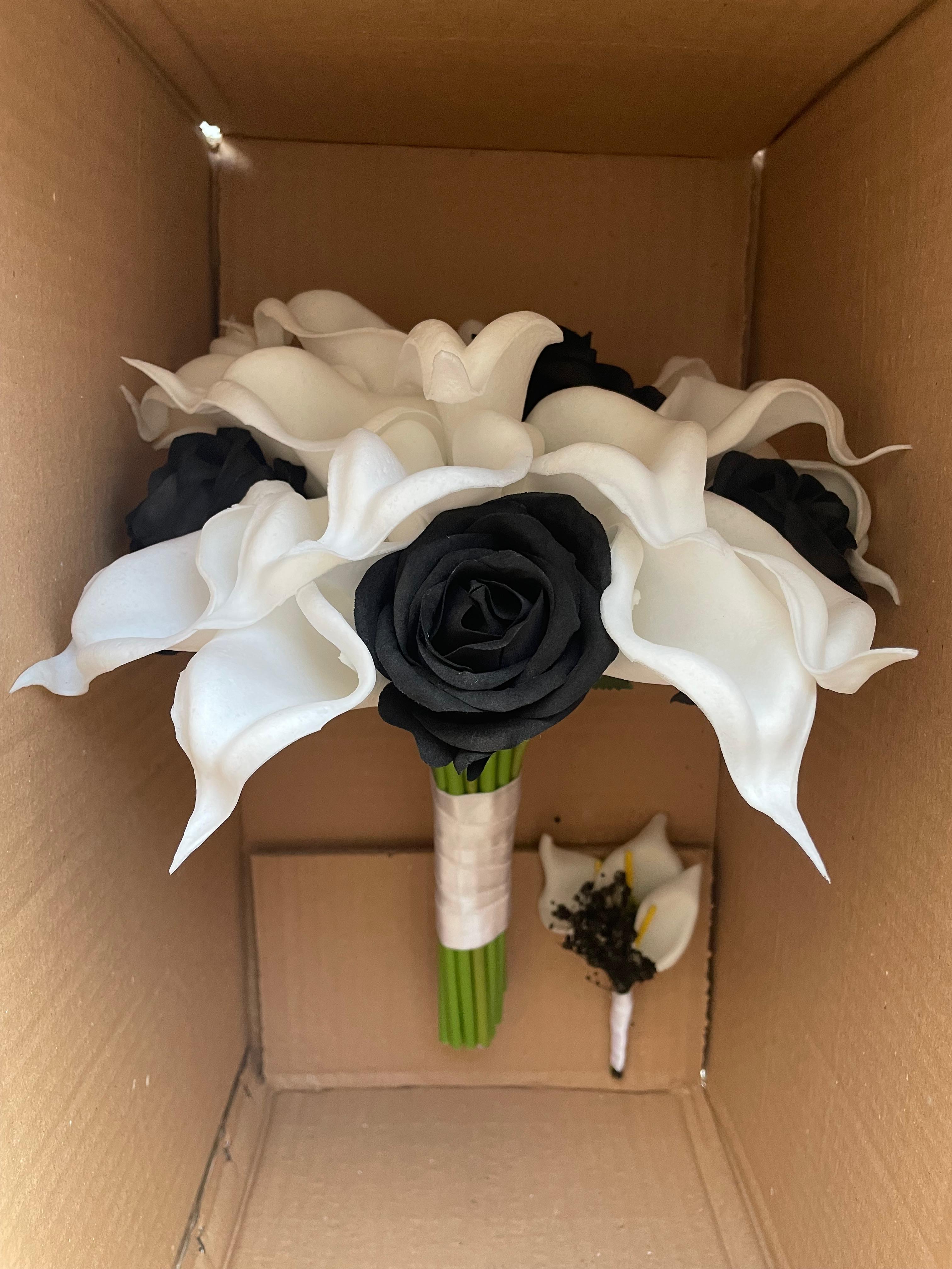 Siyah güller ve beyaz gala çiçekleriyle hazırlanan bu zarif gelin buketi, sade şıklığı ve doğal güzelliğiyle özel gününüze anlam katıyor. ? Orta boydur ne büyük ne de küçük. Yaka çiçeği hediyedir. Teslim süresi 15-20 iş günüdür; acil tarihler için not kısmına belirtmeniz yeterlidir. ?Ürünlerimiz tamamen el yapımıdır; bu nedenle her buket ve süs benzersizdir. Çiçeklerin yerleşimi ve detayları ufak farklılıklar gösterebilir, bu da ürünlerimize özel bir karakter katar. ?